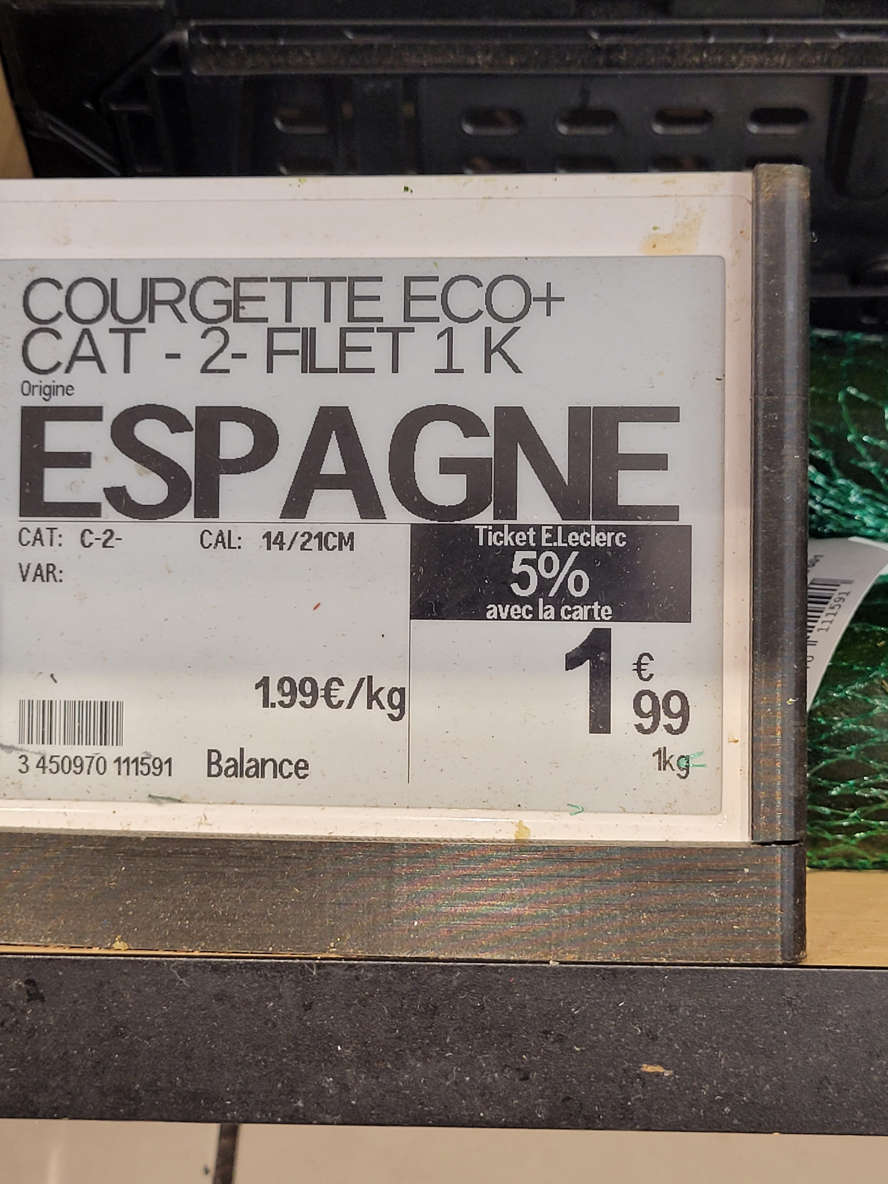 Courgettes française à 1,19 le kg, Courgettes eco d'Espagne à, tenez vous bien 1,99 le kg (notez bien Courgettes éco??) Merci magasin Leclerc le moins chère qui fait un petit déliré pour nous soutirer⁹