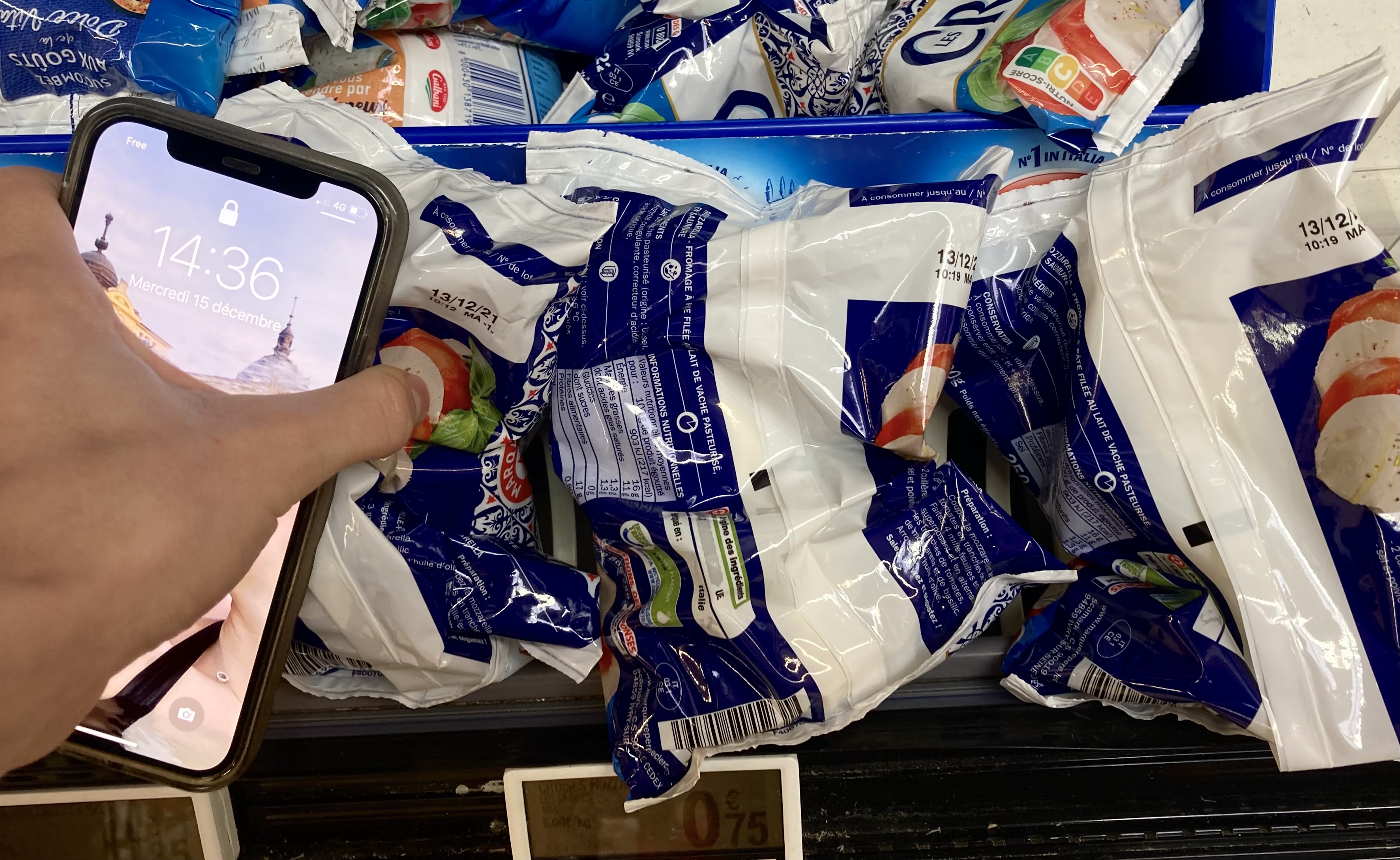 Produits périmés remis en rayon, comme d’habitude la direction va nier. Photo faite ce jour : 15/12/2021 Mozzarella périmées du 13/12/2021