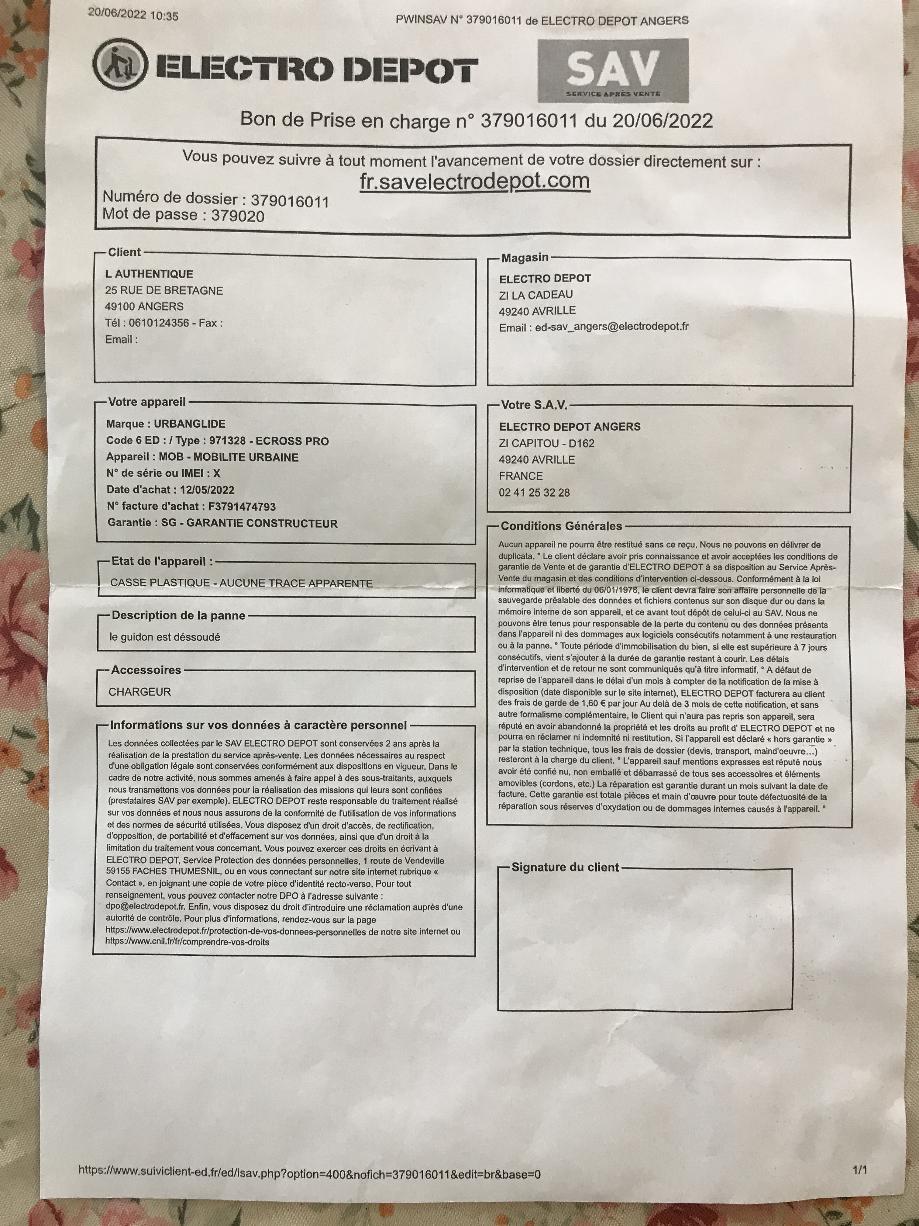 y’a un mois que J’ai acheté une trottinette 626€ le guidon est dessoudé ! Je le r’emmène a magasin. On m’as dit : ils vont l’envoyer pour la réparation. Est-ce que c’est raisonnable ? SVP donner moi une solution,je veux 1 échanger une autre ou me rembourser ! Sinon je vais à la police pour porte plainte contre ELECTRODEPOT Ps: svp regardez les photos je viens de poster et dites moi s’il est cassé par moi-même ou la produit n’est pas conforme ( n’est pas de bonne qualité) il est dessoudé !!!! Constater par un agent de SAV chez ELECTRODEPOT. voici les photos + de BON PRIS EN CHARGE
