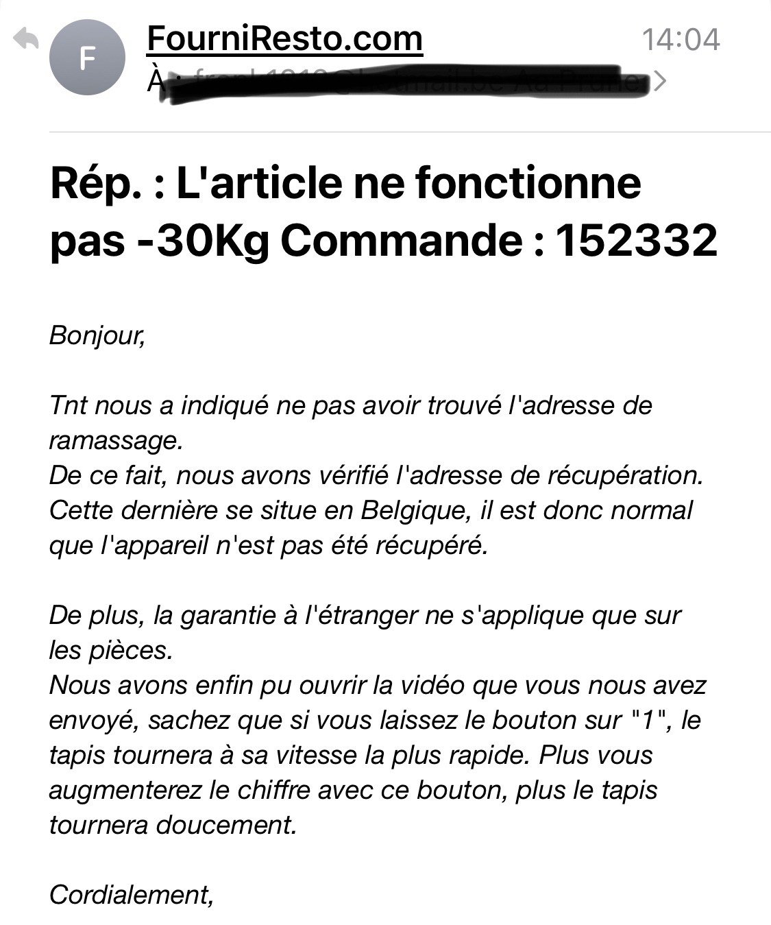 Très déçu , voilà mon expérience. Après avoir déjà eu des commandes annulées après plusieurs semaines fautes à leurs fournisseurs apparemment, j’ai encore tenté l’achat d’un convoyeur de toast, livraison en Belgique payé , ne fonctionne pas à la sortie du carton, une semaine après on me demande d’encoder l adresse avec une date , une journée à attendre et lendemain quand je demande des nouvelles, on me signale que comme c’est en Belgique il fallait lire les conditions du contrat qui en bref me dit que je peux oublier le retour de ce matériel neuf .. commercialement on aurait pu me proposer de payer les frais d’envoi .. mais bon . La photo du mail en annexe.