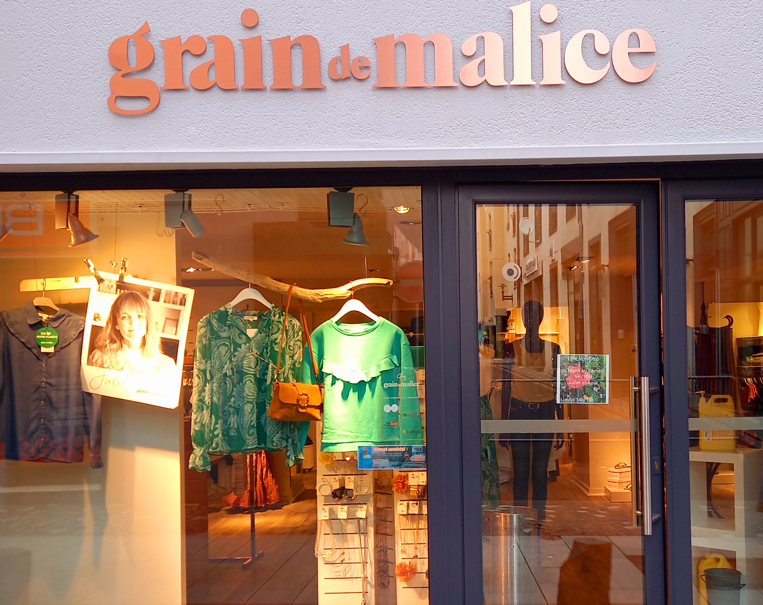 Magasin GraindeMalice Prêt à porter femme Du 36 au 48 Livraison de réassort et nouveautés chaque jour Large choix de prêt à porter Robes, pantalons, Jeans 👖, jupes, hauts, vestes, pulls, foulards, chaussures... Magasin Grain de Malice Saint-Flour, nouveau concept, situé en centre ville, rue des Lacs à Saint-Flour 😉