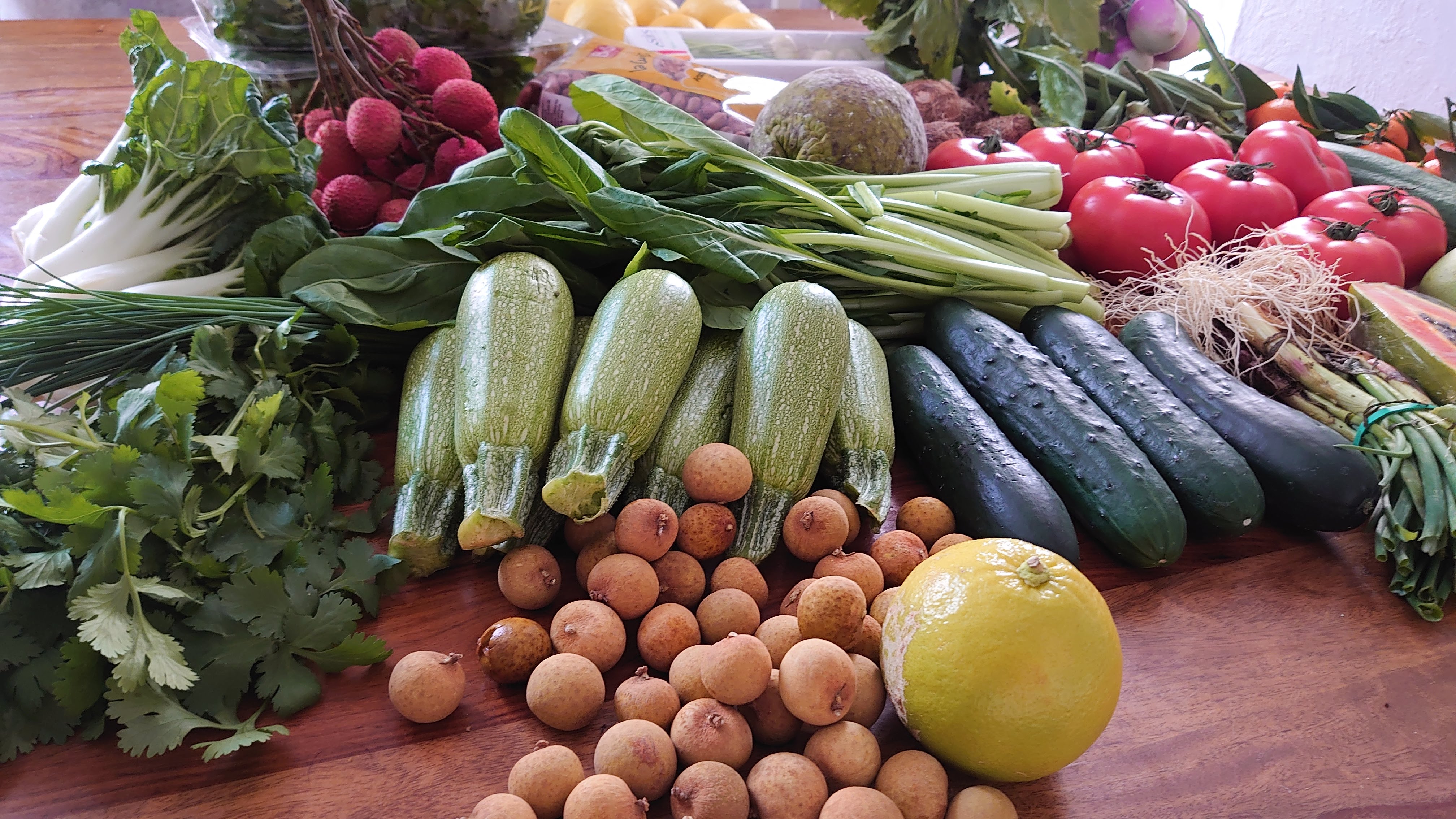 Jolis légumes variés. Divers produits en complément. De quoi faire d excellent repas de l'entrée au dessert. Prix interessants