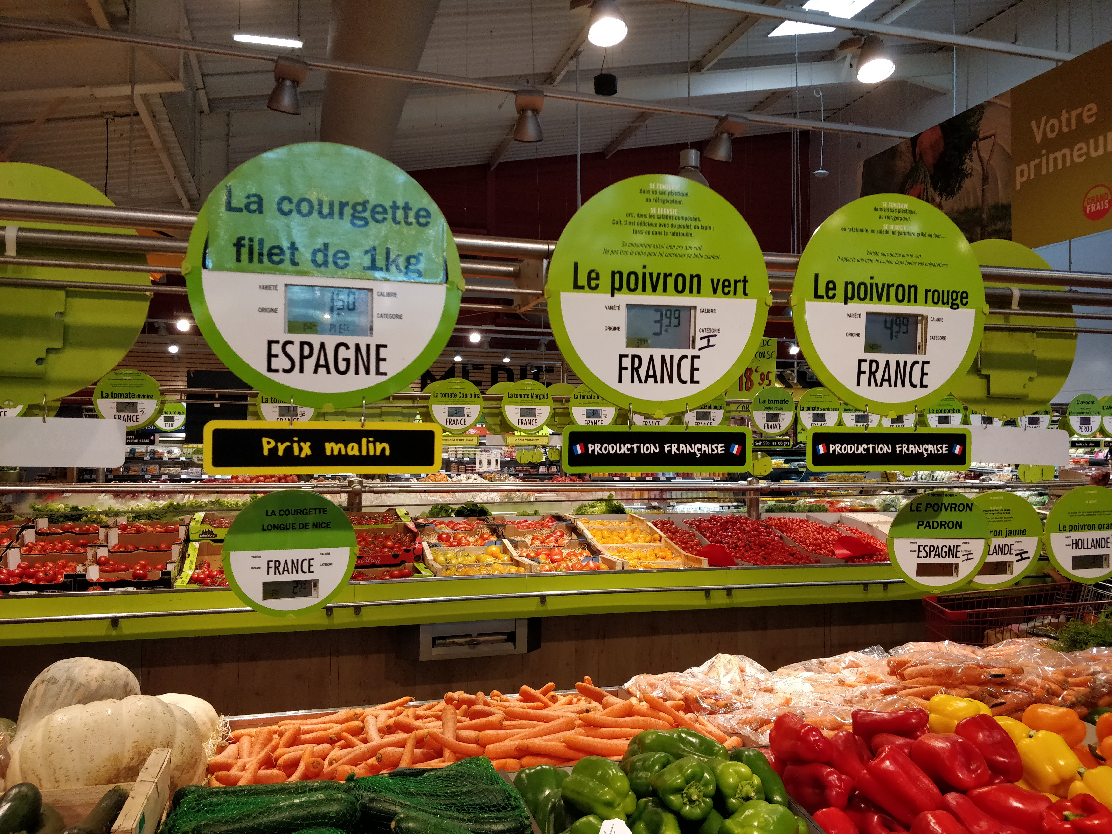 Du choix mais malheureusement trop de produits ESPAGNOLS, GRAND FRAIS visiblement n'a pas compris que les clients veulent de plus en plus des produits FRANCAIS et on voit bien que c'est possible et avec un minimum de traitements...aucun BIO non plus, dommage...GRAND FRAIS est en retard et risque d'en faire les frais à terme...puisqu'il y a des produits du MAROC, ça serait bien à cette saison d'importer des SLAOUI (courges marocaines) qui n'existent pas ici mais sont exceptionnelles...bonne viande en général..