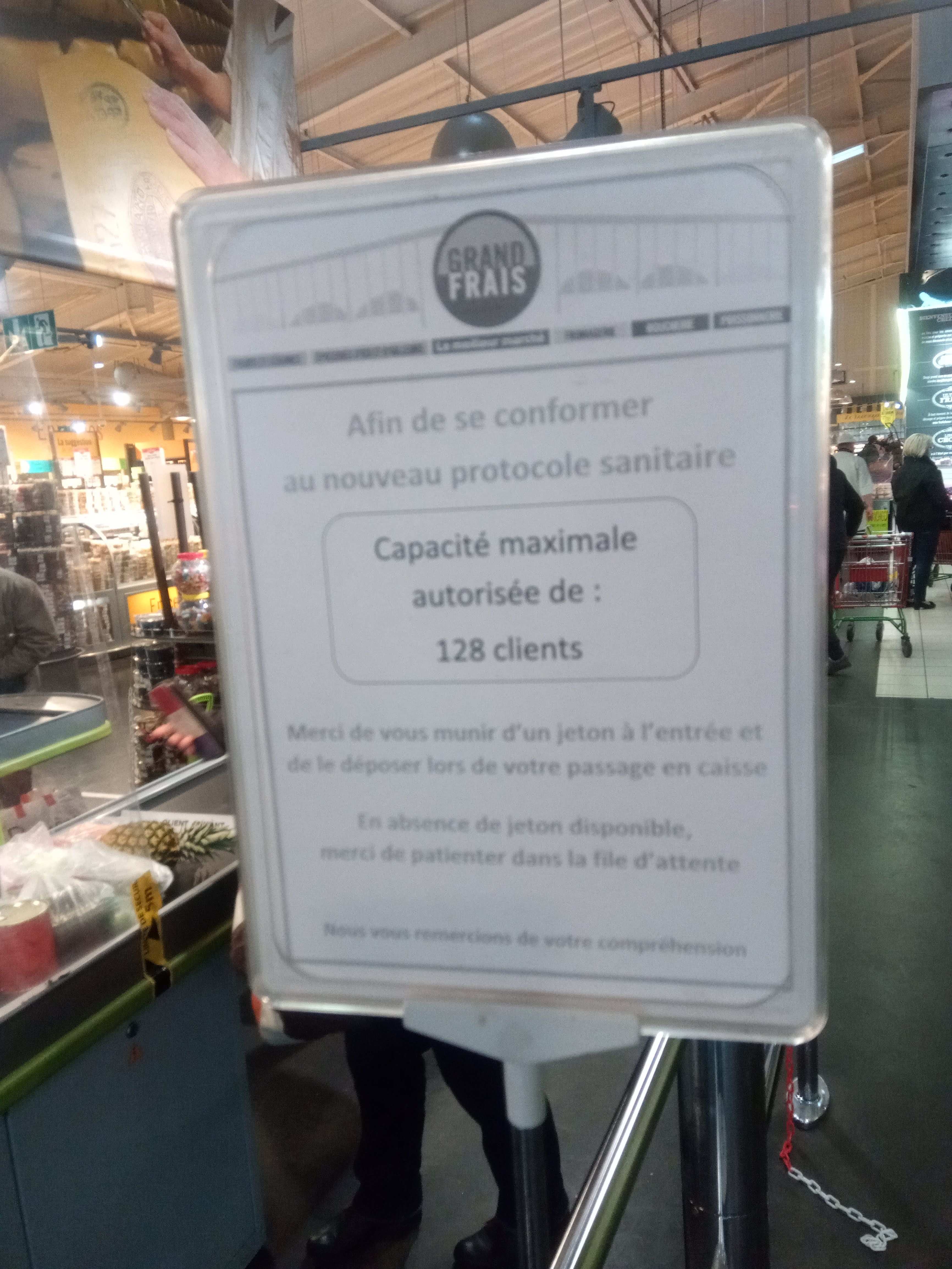 Heure d'affluence samedi 23 janvier, parking blindé. Écriteau à l'entrée du magasin sur le nombre de clients à l'intérieur. 128 clients. Plus de 200 personnes à l'intérieur. Honteux !!!!