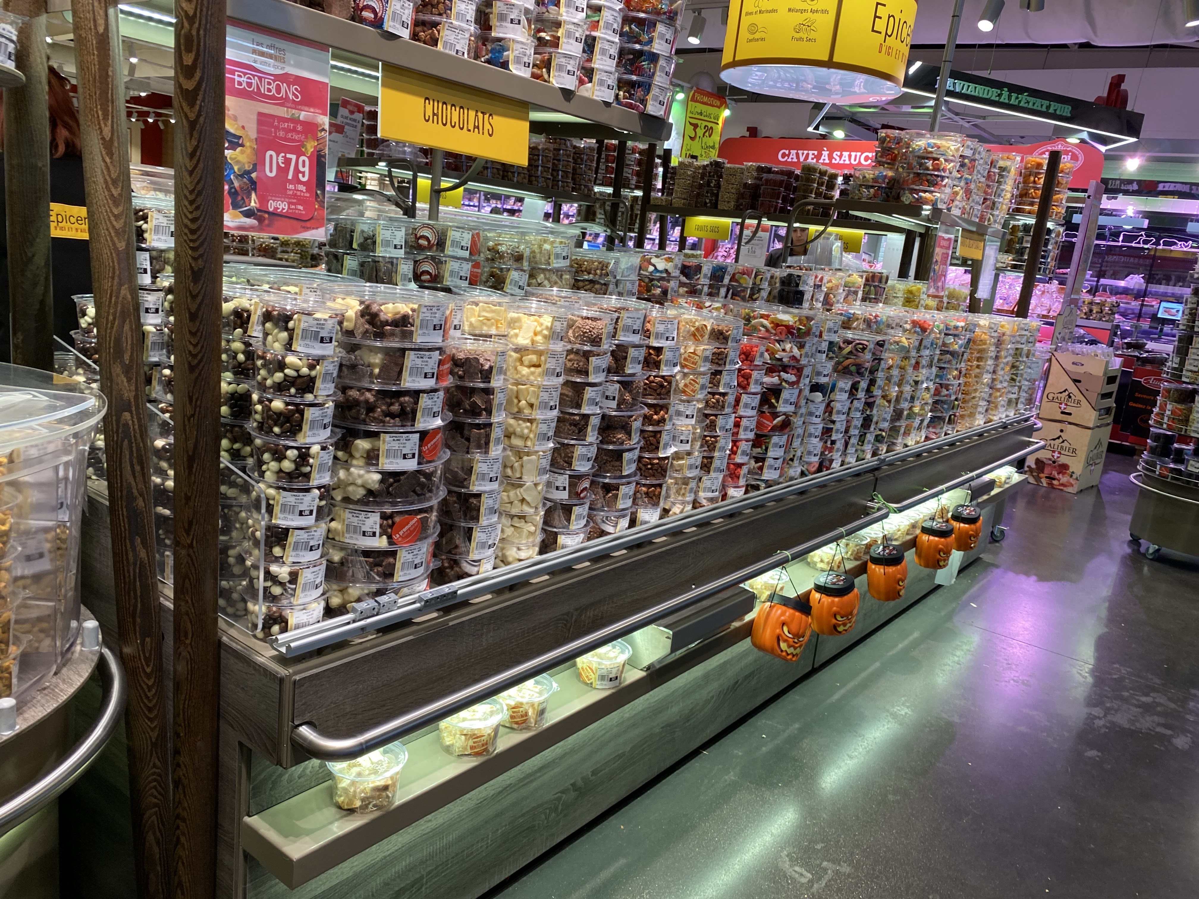 On y trouve de tout en matière de fruits et de légumes, une boucherie bien achalandée, idem pour la fromagerie et toute une épicerie classée par pays d'origine. N'oublions pas le manège aux bonbons, fruits secs sucrés ou salés, olives et fruits confits.