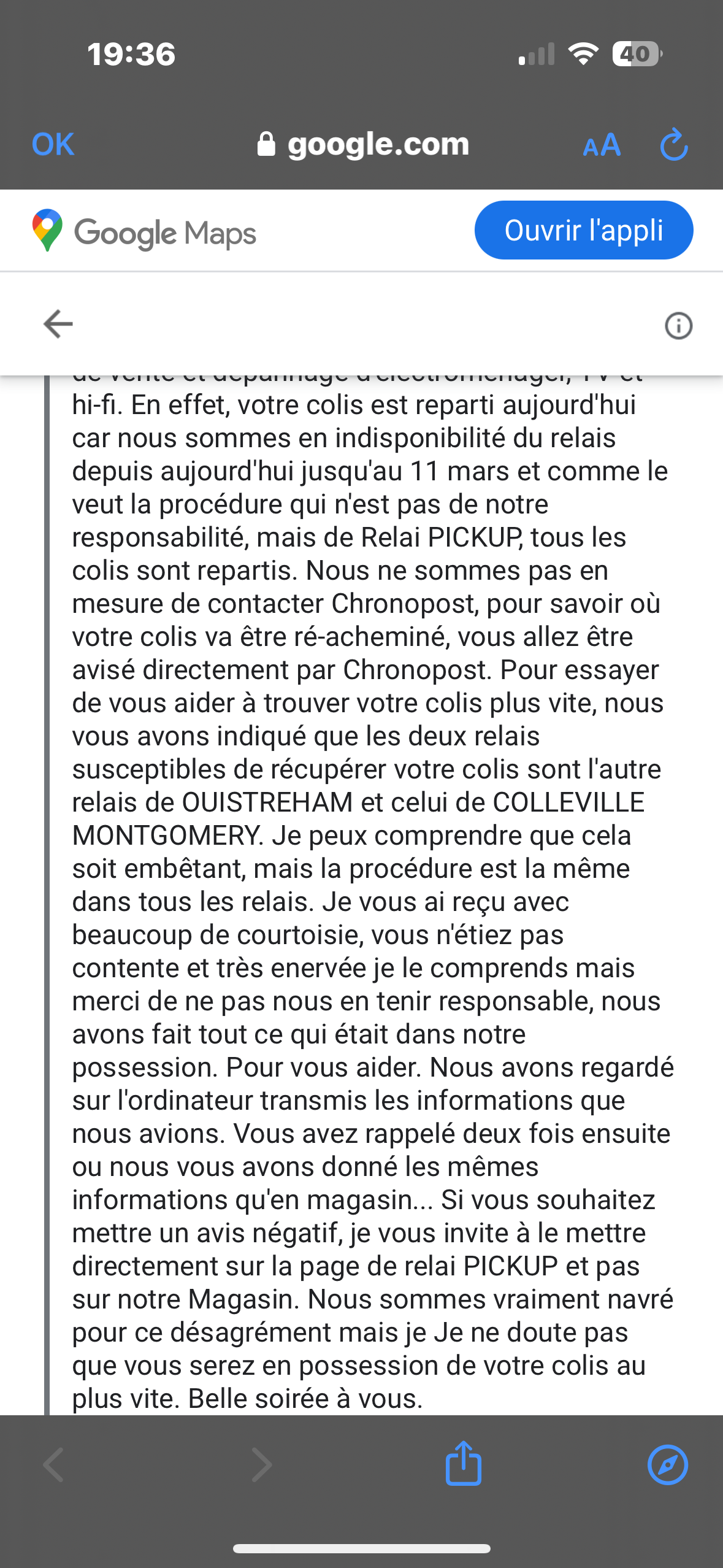 Responsable très peu sympathique colis plus en sa possession (quelle fut ma surprise ) transférer dans un autre relais je lui demande d’appeler pour savoir où est mon colis . Réponse du responsable aller voir les autre relais colis je peux pas vous aidez c’est à moi de faire tous les relais colis alentour alors que mon colis avait était livré chez lui Afin de vous répondre De dite pas des choses fausses à quelle moment jetait très énerver j’étais agacé certes mais je suis rester également poli et calme. Et vous vous avez était non serviable ni arrangeant quant je vous est demander si vous pouviez apeller votre confrère qui fait relay colis . Vous avez était hautain et sans vouloir m’apporter le peut d’aide que vous auriez pu.