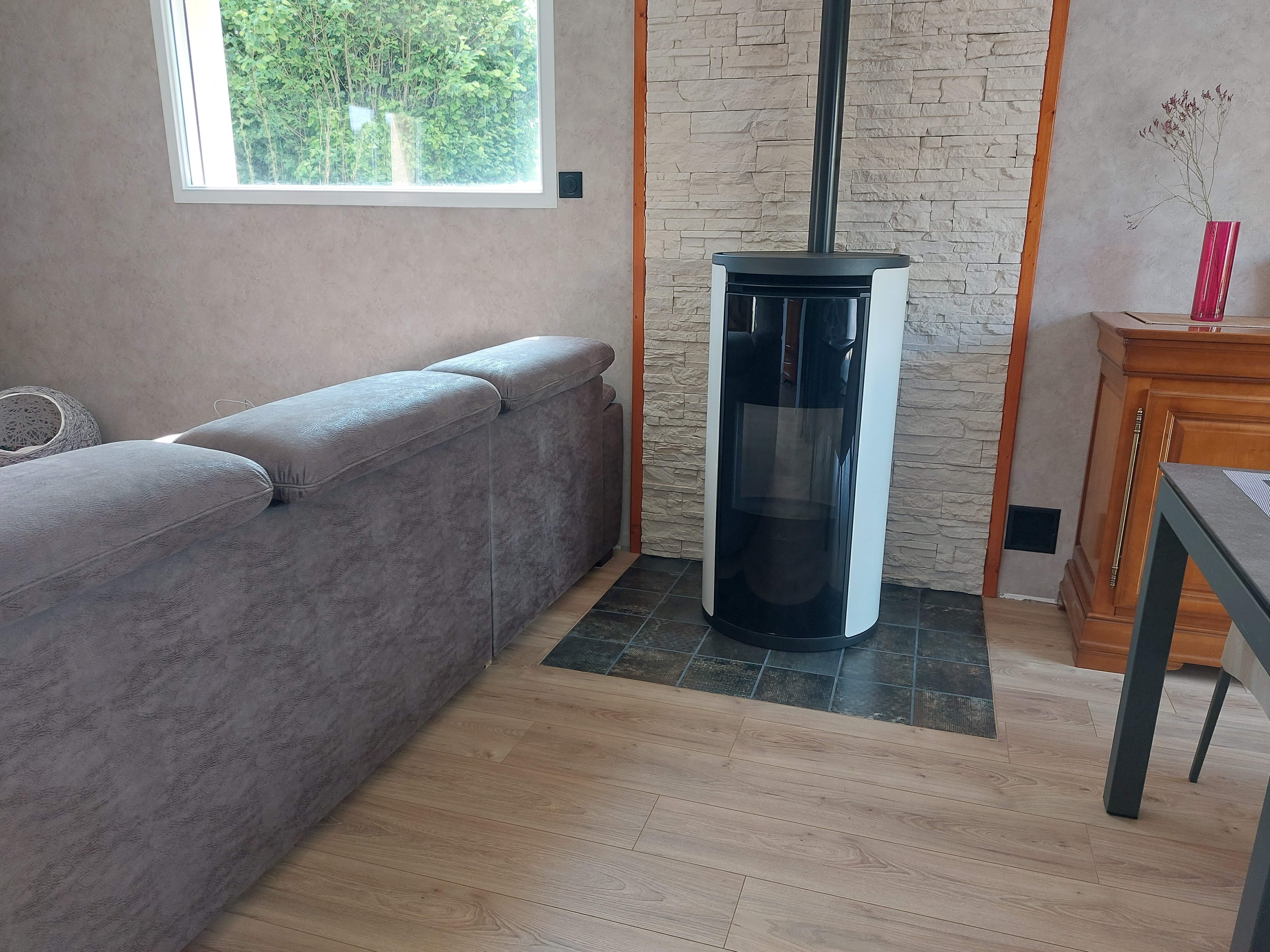 Bonjour à tous, installation du poêle à bois, à la date prévue.i'tervention c'est bien passé, travail propre, entreprise honnête, remboursement d'une pièce pas monté, Merci à David pour les bons conseils, première journée d'utilisation et déjà beaucoup moins de bois. Un bémol pierre inférieur marqué par une veine dans la pierre qui fait plus défaut que naturelle. On verra par la suite sachant que c'est notre seul chauffage pour 100 mètre carré.