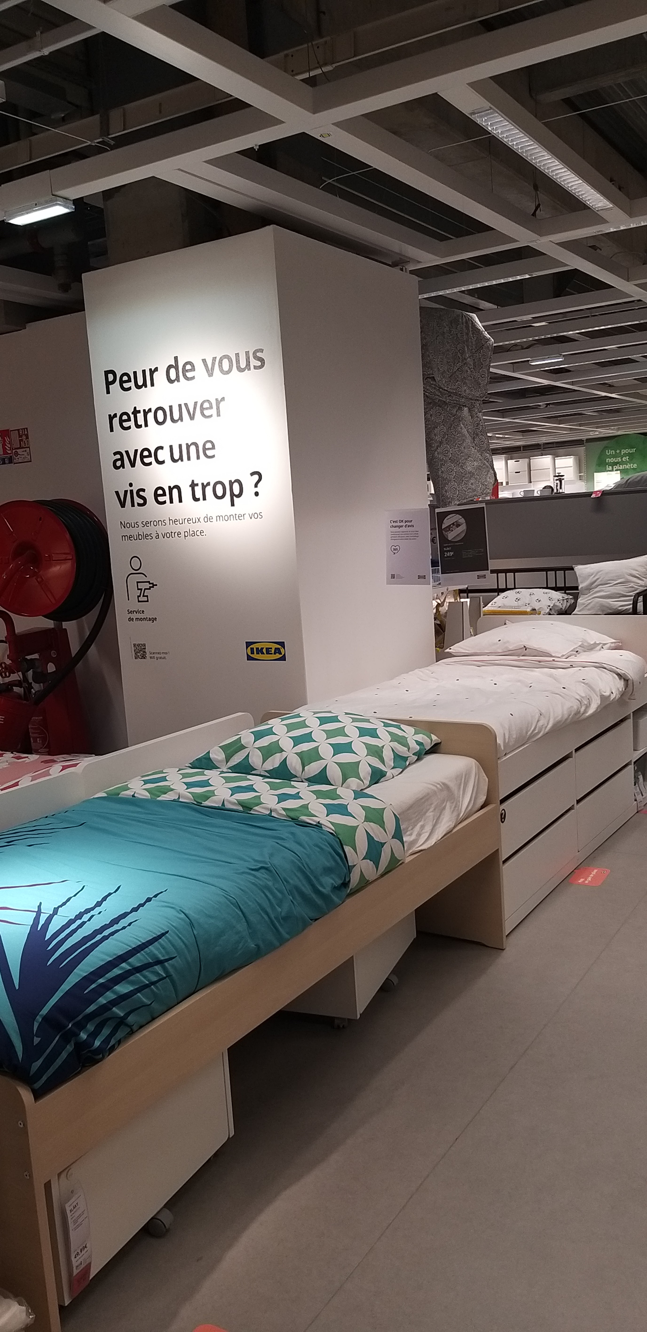 Très mauvaise expérience, la première et sans doute la dernière - le labyrinthe interminable du magasin - le très long délai avant de pouvoir passer la commande, alors que le magasin était loin d'être saturé de clients - Une conseillère client qui n'écoute pas ou qui ne comprend pas mes besoins (livraison+montage de lits, des problèmes de santé m'empêchant de le faire moi-même) - un service catastrophique: le montage n’est plus assuré par IKEA par des « taskeurs » indépendants, il faut prévoir un délai suffisant entre les deux, très contraignant au niveau disponibilité - le taskeur réservé est arrivé avec plus de 3 heures de retard (20h+ au lieu de 17h), donnant si peu d'informations sur son retard que je n'ai pu disposer de ce temps pour faire d'autres choses urgentes - il m'a laissé un monceau de cartons et d'emballages, affirmant que cela ne faisait pas partie de son travail de m'en débarrasser, et concluant malgré tout par un fier « mission accomplie »