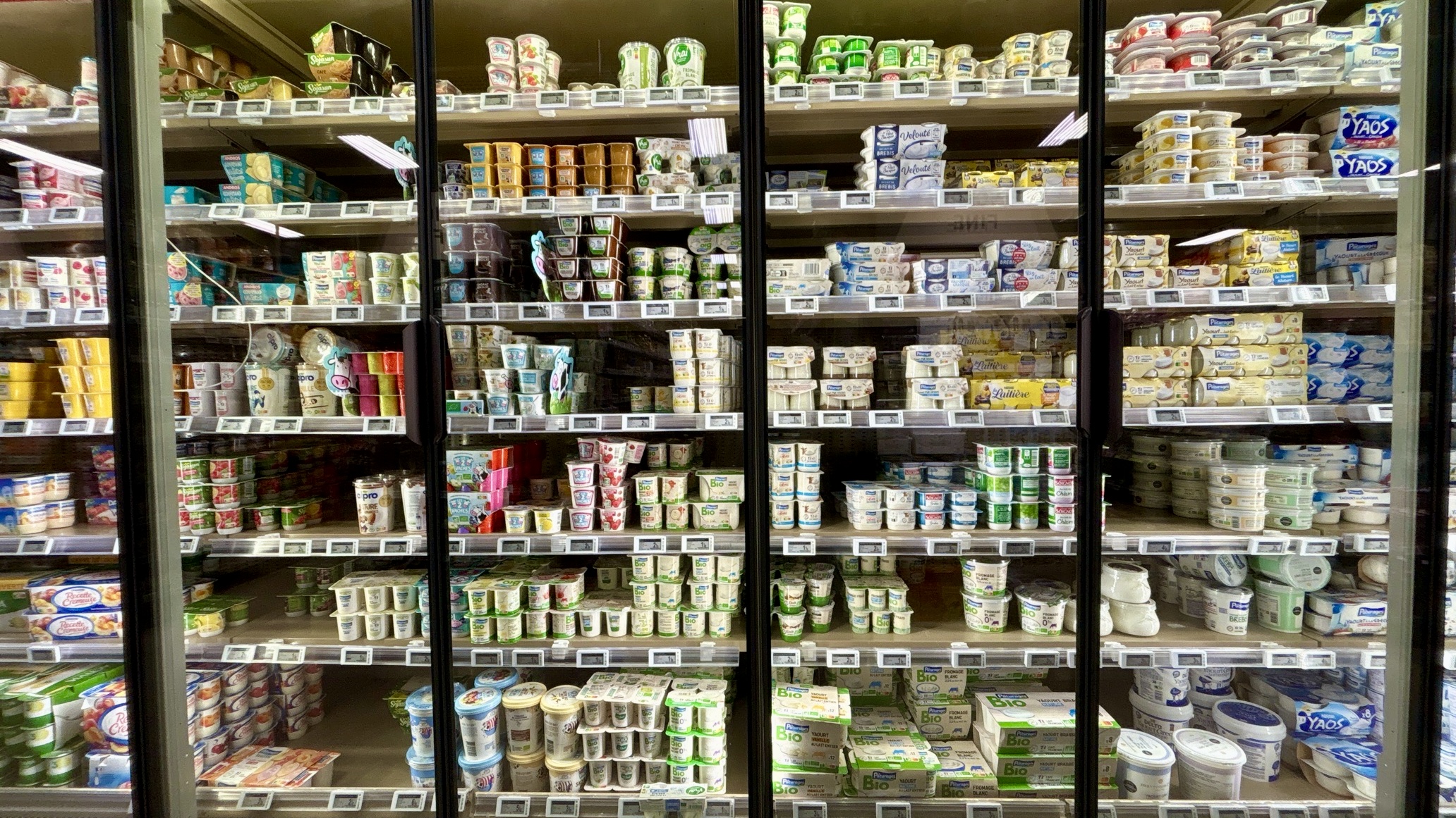 Intermarché propre et lumineux. Le rayon bio est en face de la zone fruits et légumes à proximité des caisses. Les yaourts sont sur plusieurs éléments en zone ultra frais et les fromages sont de l’autre coté avec les viandes.