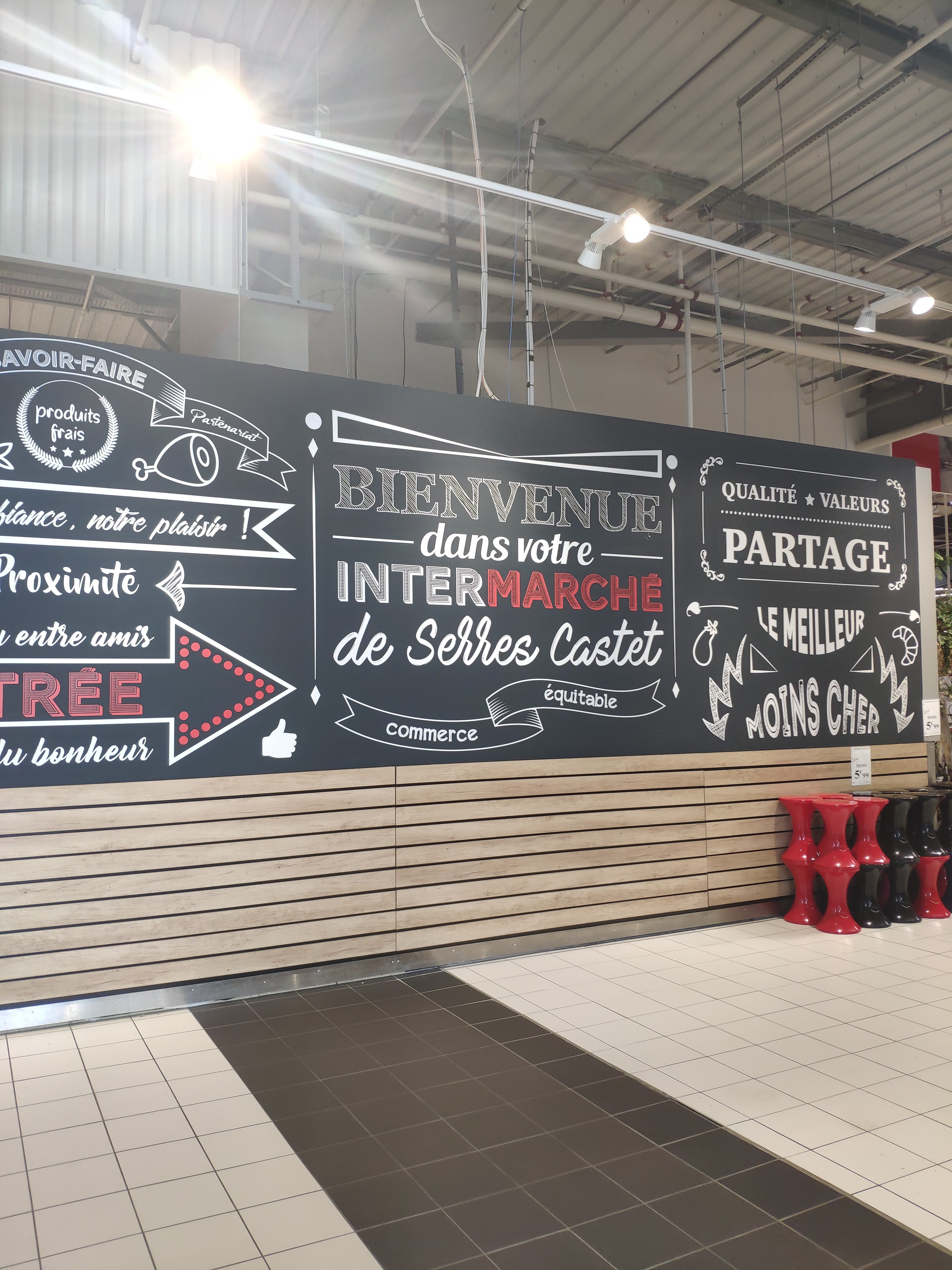 Grand parking. Petite galerie marchande sympa avec coiffeur coiff and co,les jardins d'Ophélie fleuriste, opticien Alain Afflelou,vapozen magasin cigarette électronique,o pressing service cordonnerie clés minutes multi services, Jeanette et Leon pâtisserie et snacking, bistrot du marché et espace culturel. Rayons bien achalandés Intermarché. Éclairage agréable. Bonne gestion des produits et des espaces. Rayon poissonnerie et boucherie super. Petit plus qui apparaît dans peu de magasins,il y a une machine qui permet la désinfection des caddies. Plexiglas aux caisses.