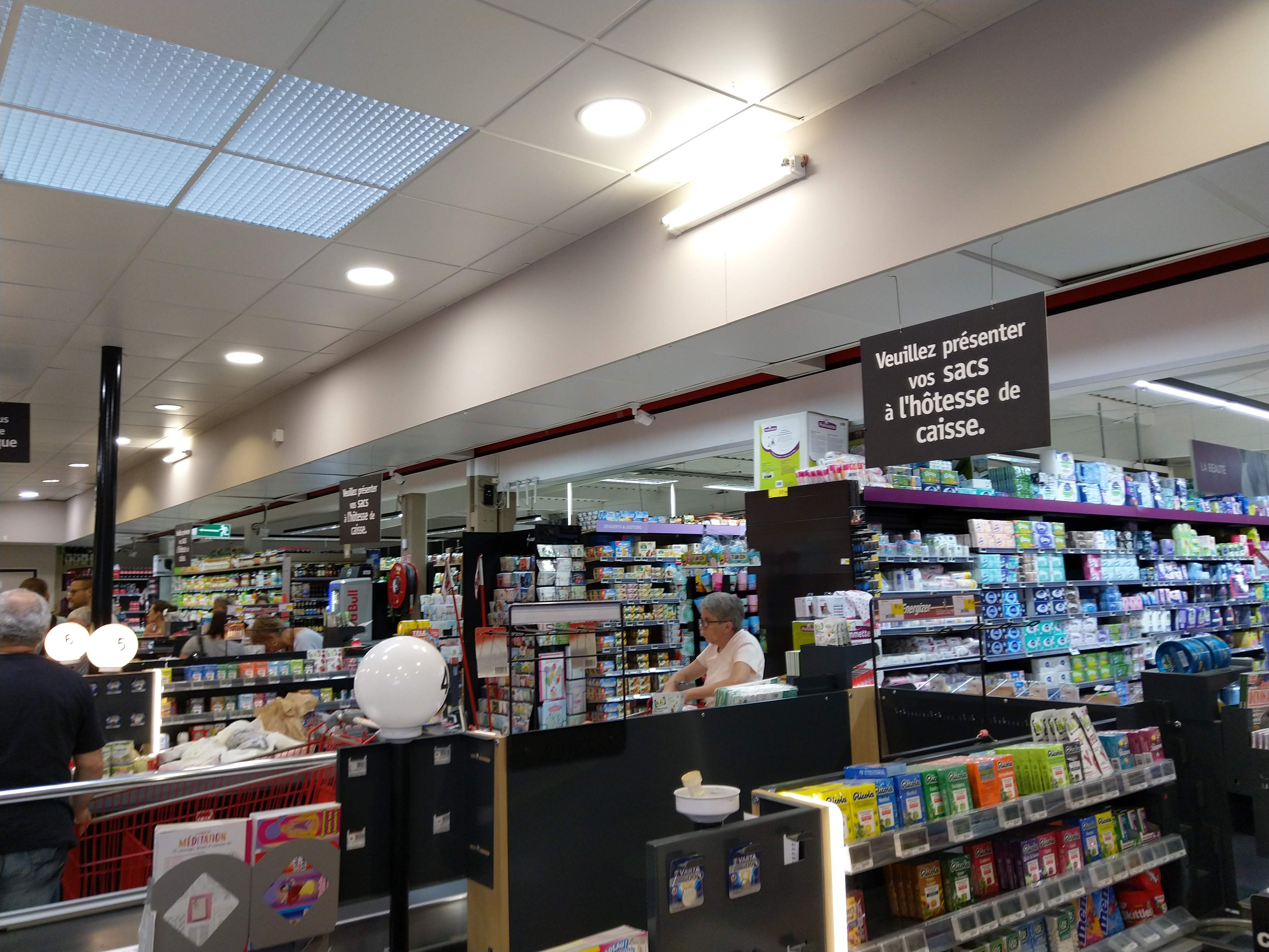 Supermarché fonctionnel, un peu d'attente aux caisses.
