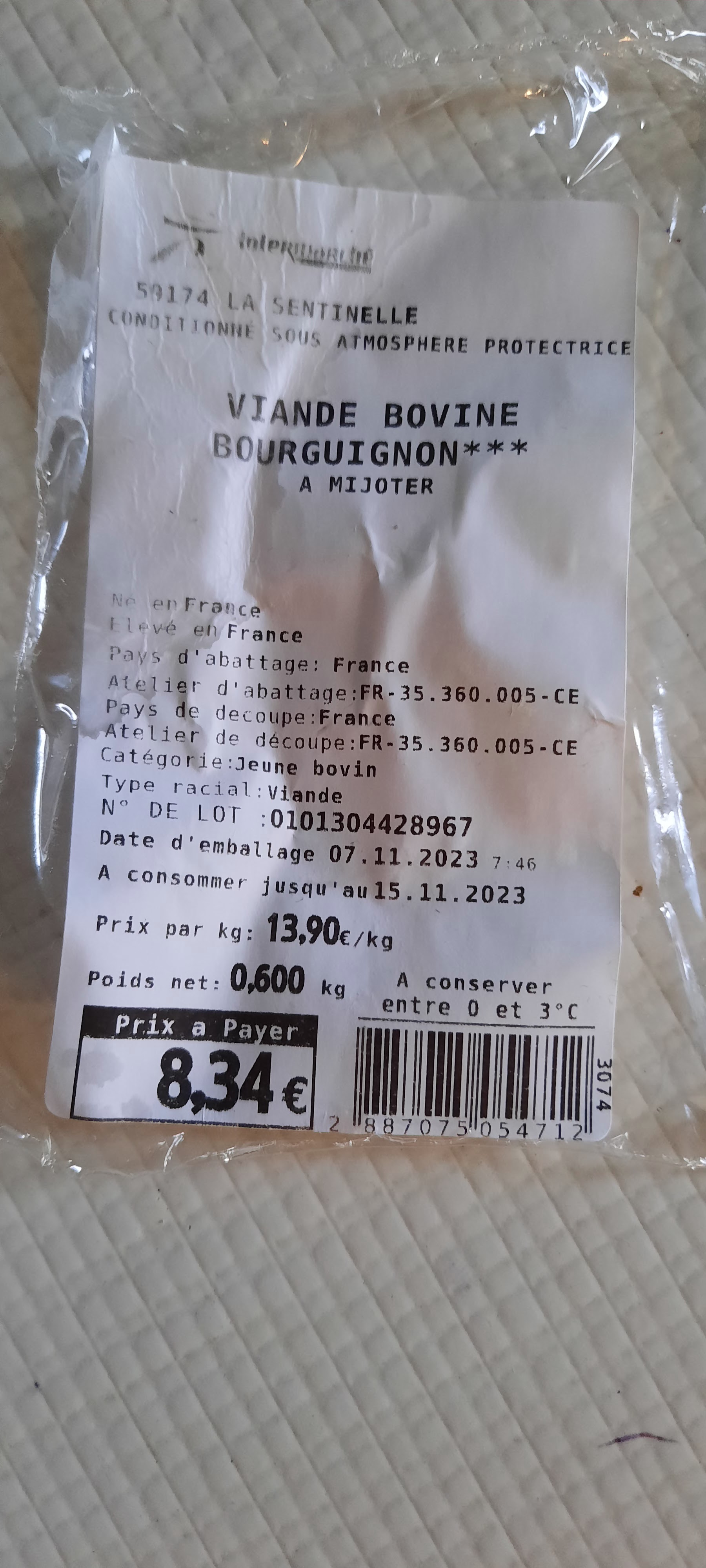 Bonjour, Aujourd'hui, j'ai préparé mon bourguignon. Quelle surprise en découvrant ma viande. Dans la barquette de viande bovine bourguignon de 600g à 8,34€, il y avait 270g de nerfs, quel gâchis!! (Il ny avait pas de viande bourgignon au rayon boucherie, de toute façon faut attendre au moins 15mn pour qu'un boucher vienne). Je suis vraiment déçu d'autant plus que c'est bien caché. Désormais j'irais chercher ma viande ailleurs.