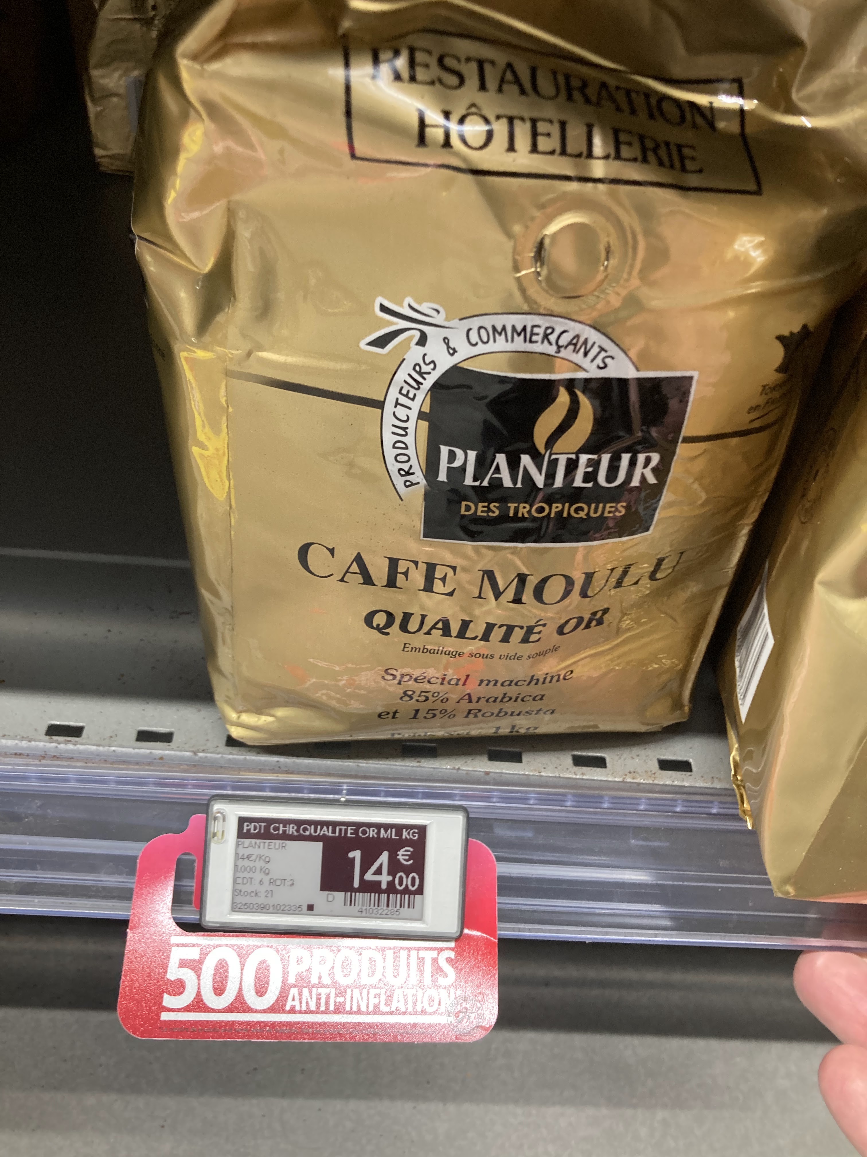 Alors là j'hallucine !!! Bonjour, Habitue à acheter dans plusieurs Intermarche a Orry la ville et Lamorlaye je connais très bien les prix, dans l'Oise. Le cafe en paquet de 1 kg de la central d'achat Intermarché (cette marque n'est que dans les inter et pas ailleurs) que j'achetais 8€.. avant covid est passé à 12€ ?? il y a quelques mois... donc plus de 50% d'augmentation ?? après augmentation Intermarché a le culot de mettre une affiche prix bloqué pour le trimestre ont hallucine ! Au jour d'aujourd'hui le paquet est passé à 14€99 !!! soit 15€ Soit au total une augmentation de 100% le prix a doublé !!! Le cafe n'est pas fabrique en Ukraine que je sache et ont constate que certaine enseigne spéculent sur certains produits. Quitte à payer le prix du cafe central d'achat Intermarché au prix d'un torréfacteur autant changer de marque de suite. Je ne vise pas les responsable de magasin qui n'y sont pour rien je suppose mais j'aimerais bien que l'info remonte chez les dirigent d'intermarche, car je pense qu'avec une tel politique de prix vous allez perdent des clients a commencer par moi. Je ne voit aucune justification a cette augmentation hallucinante et j'ai change de marque de café. Cordialement Remi ancien client fidèle..