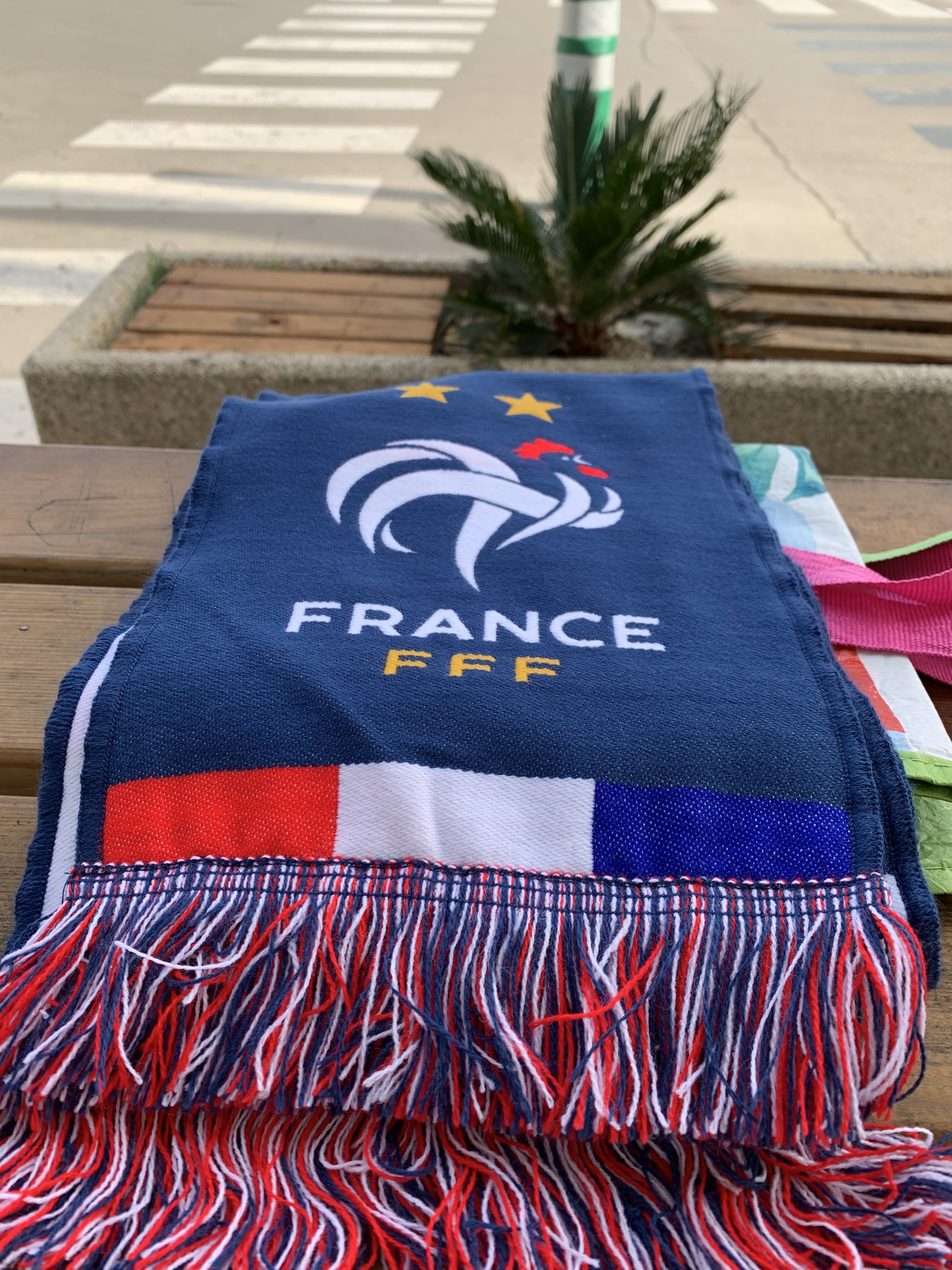 Nous avons gagné une écharpe de l’équipe de France, mais il y a une petite erreur dans l’ordre des couleurs du drapeau français. On s’y habitue, surtout qu’on a vu la patrouille de France survoler Paris un 14 juillet avec les couleurs interverties.