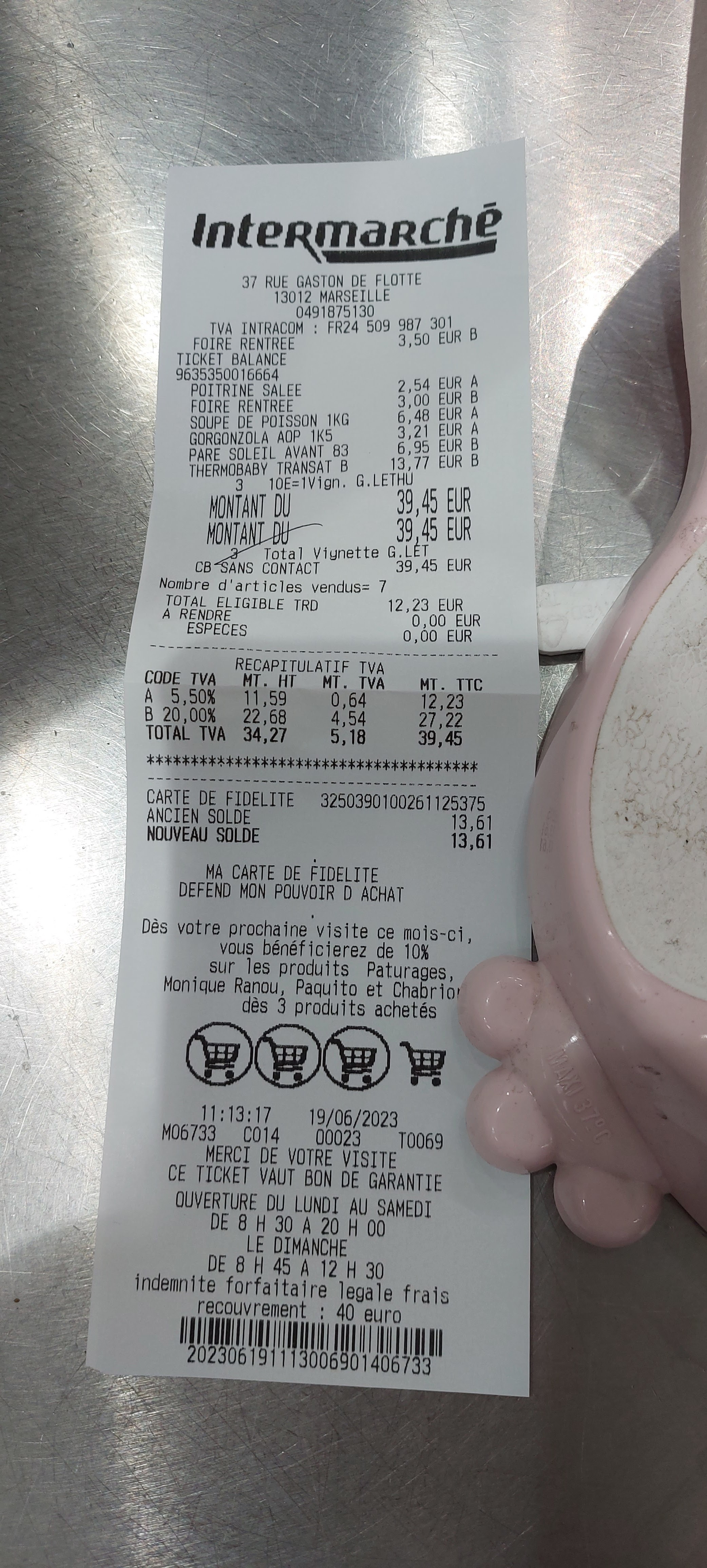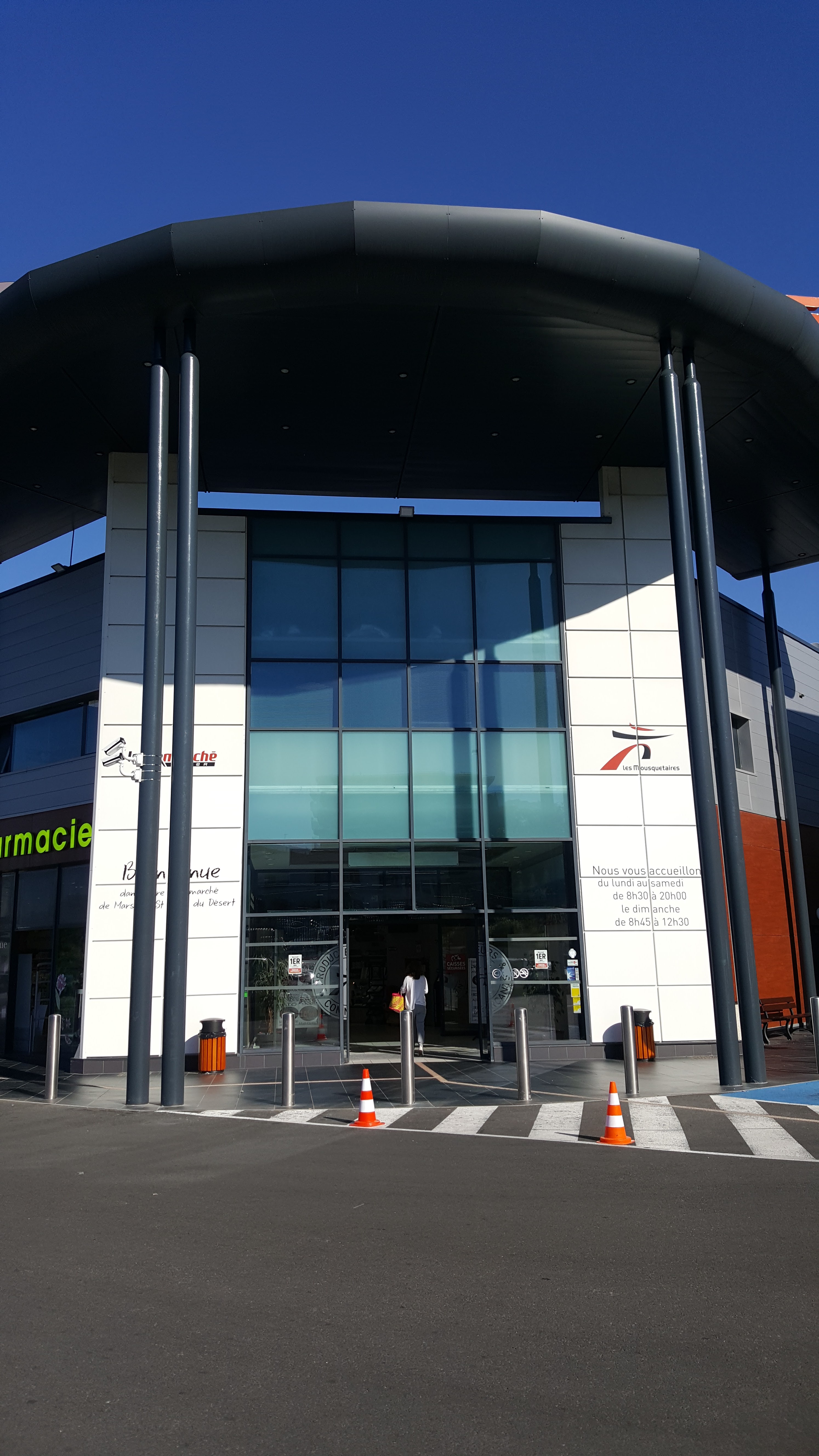 Premièrement Intermarché est équipé d'une pompe à essence très bon marché, la première dans le secteur en terme de qualité de prix. Ce qui est un gain de temps considérable en allant faire les courses. De plus au sein même de l'Intermarché vous avez une pharmacie intégrée et aussi un coiffeur au fond. Intermarché est équipé d'un drive, de rayon presse et jouets, d'un grand rayon promo à l'entrée, d'une poissonnerie, d'un boulanger qui fait un excellent pain tout au long de la journée à 0.85 € la baguette !!! Les produits frais et les fruits et légumes sont au centre du magasin. Avec la carte de fidélité vous ferez rapidement des économies car pas mal de produits sont remisés. Le gros point négatif surtout pour moi c'est qu'il n'y a pas de viandes hallal ou cacher même dans le rayon reste du monde ce qui est dommage pour tous les musulmans et juifs mais aussi pour le magasin qui perd du coup certains clients à ne point douter...Car de nos jours que ce soit Auchan, Carrefour, géant casino tous ont compris que c'était primordial d'être au plus proche des clients de toutes races. Sinon vous avez un grand parking gratuit (à 2 étages maintenant) ce qui est plutôt pratique. L'accueil des caissières est dans l'ensemble très positif et le Monsieur de la sécurité (crâne rasé) est vraiment d'une gentillesse formidable !! Enfin vous pouvez utiliser jusqu'à 3 tickets restos sans avoir besoin de prendre que de la bouffe, ce qui n'est pas négligeable !!! Intermarché est ouvert du lundi au dimanche : horaires : Lundi : 08h30 - 20h00 Mardi : 08h30 - 20h00 Mercredi : 08h30 - 20h00 Jeudi : 08h30 - 20h00 Vendredi : 08h30 - 20h00 Samedi : 08h30 - 20h00 Dimanche : 08h45 - 12h30
