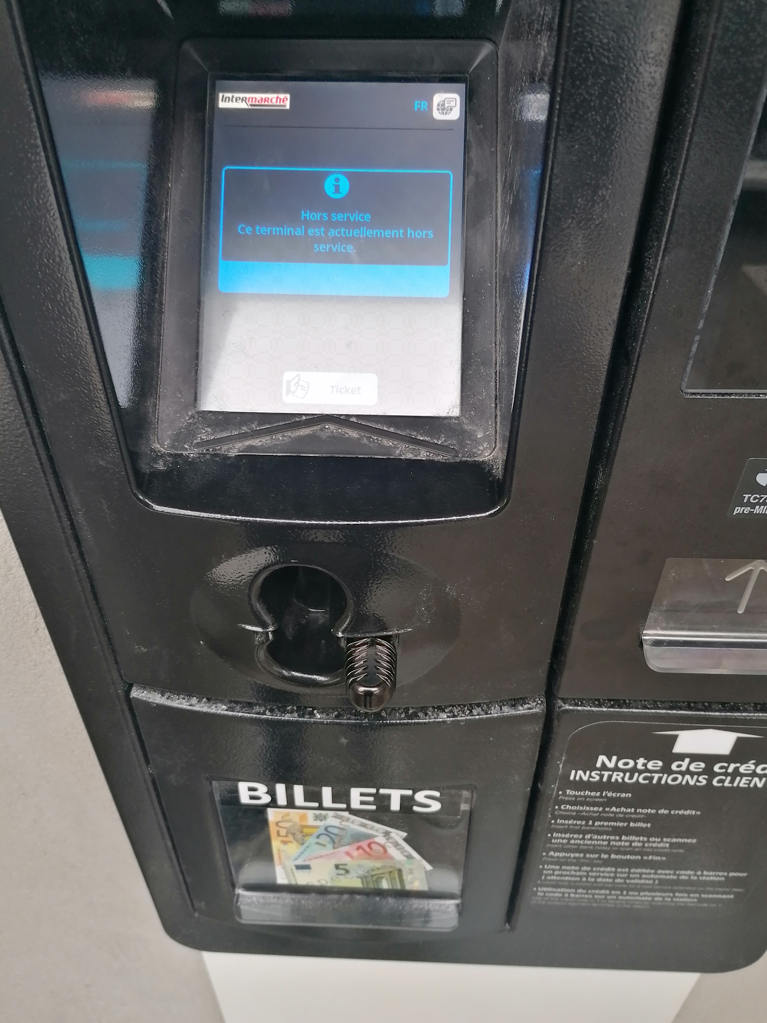 Une semaine que le paiement en espece est mise en place et 4 jours que la machine est en panne... Chapeau l'équipe.. Moins reactif que ca tu meurs..