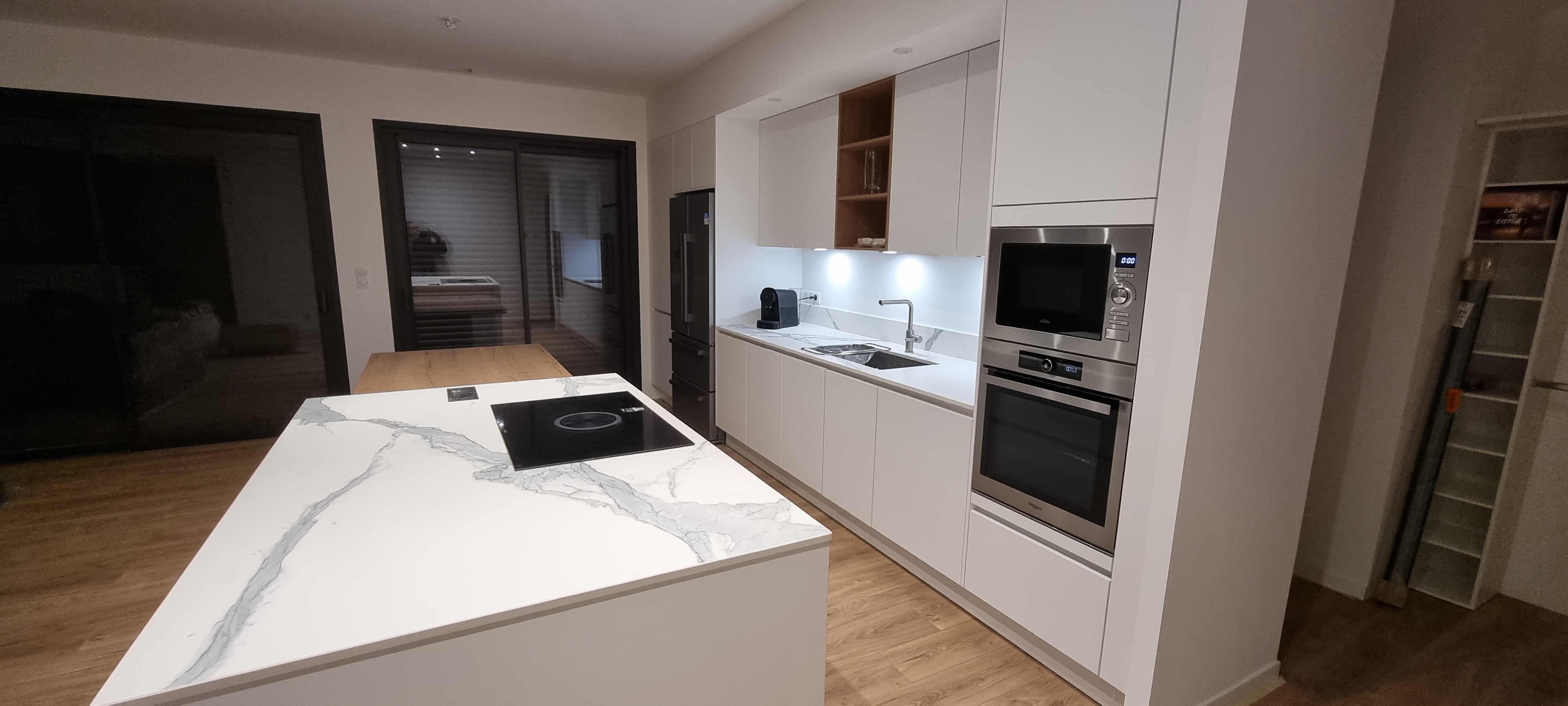 Tout d'abord, un grand MERCI à Lory Liguori pour la création et la réalisation de ce projet. Ses conseils, sa réactivité, son intuition à mon encontre ont été exceptionnels. Chaque détail fut étudié avec finesse et précision.....tous les plans pour la pose étaient parfaits, précis au millimètre, très détaillés....Quant aux poseurs, Frédéric et Antoine,j'en ai été particulièrement enchantée....deux jours non stop de travail,beaucoup de découpes difficiles,de la sueur et des rires....le plus....la création d'un bandeau lumineux sous l'îlot central..excellent