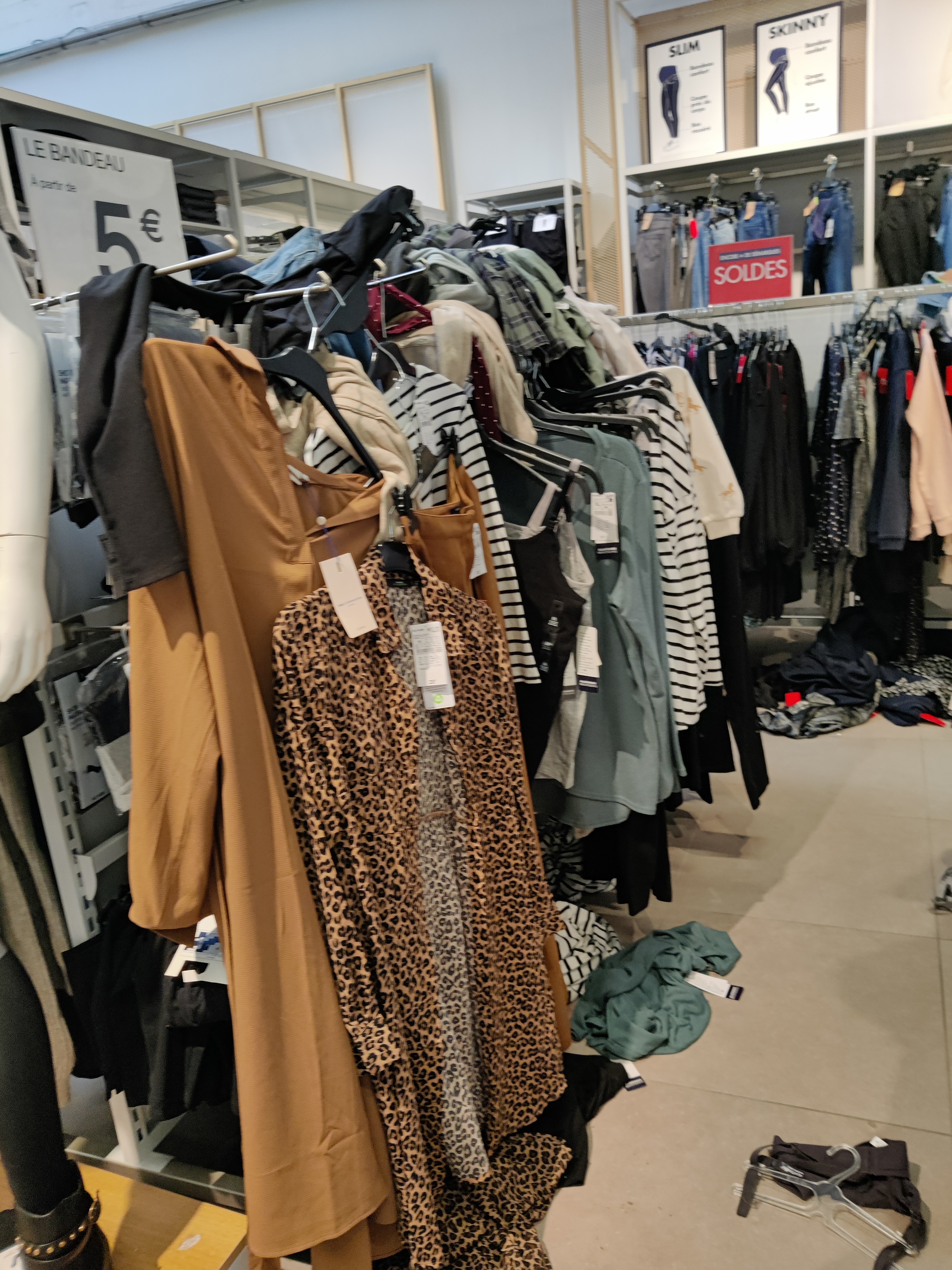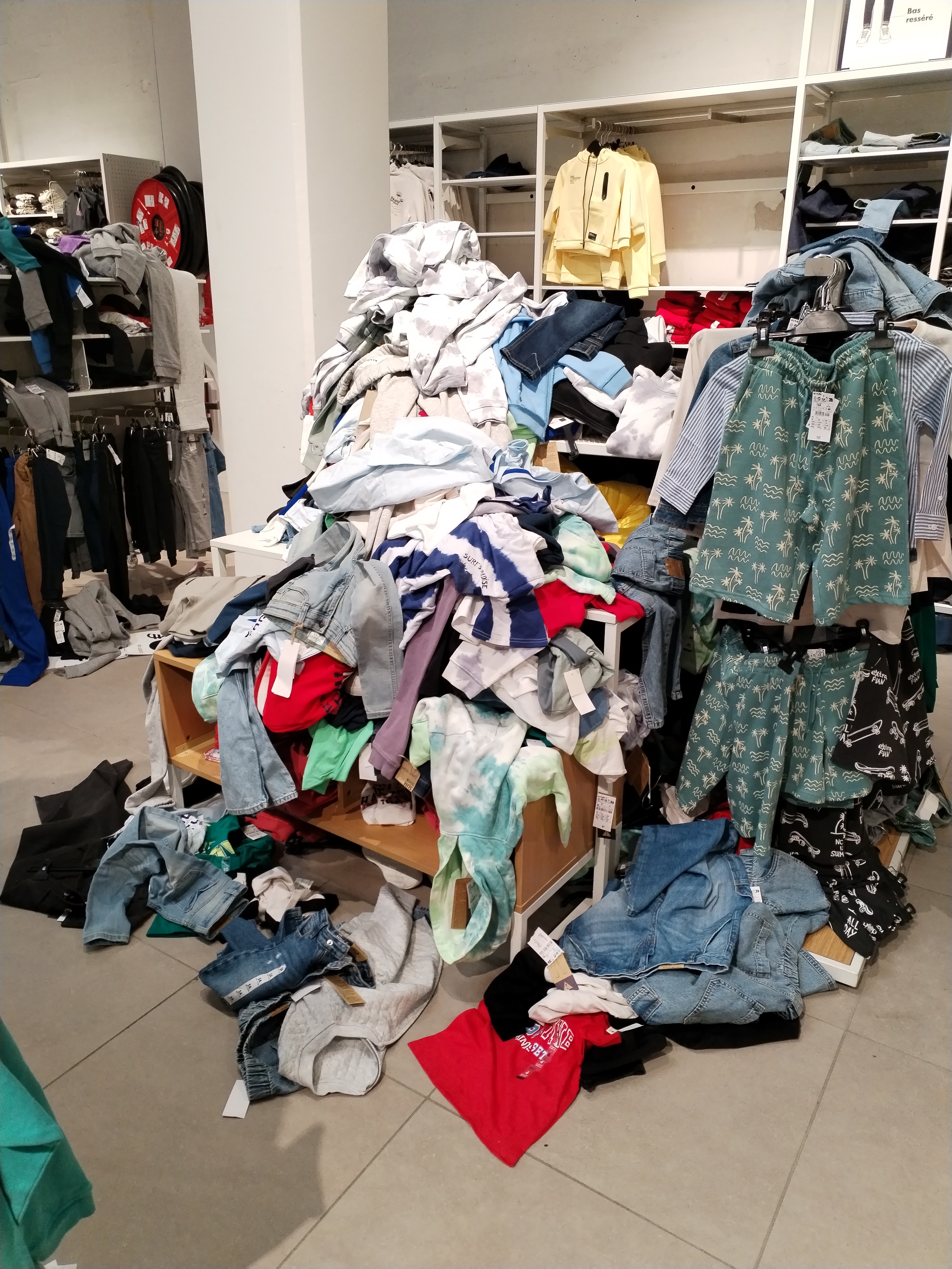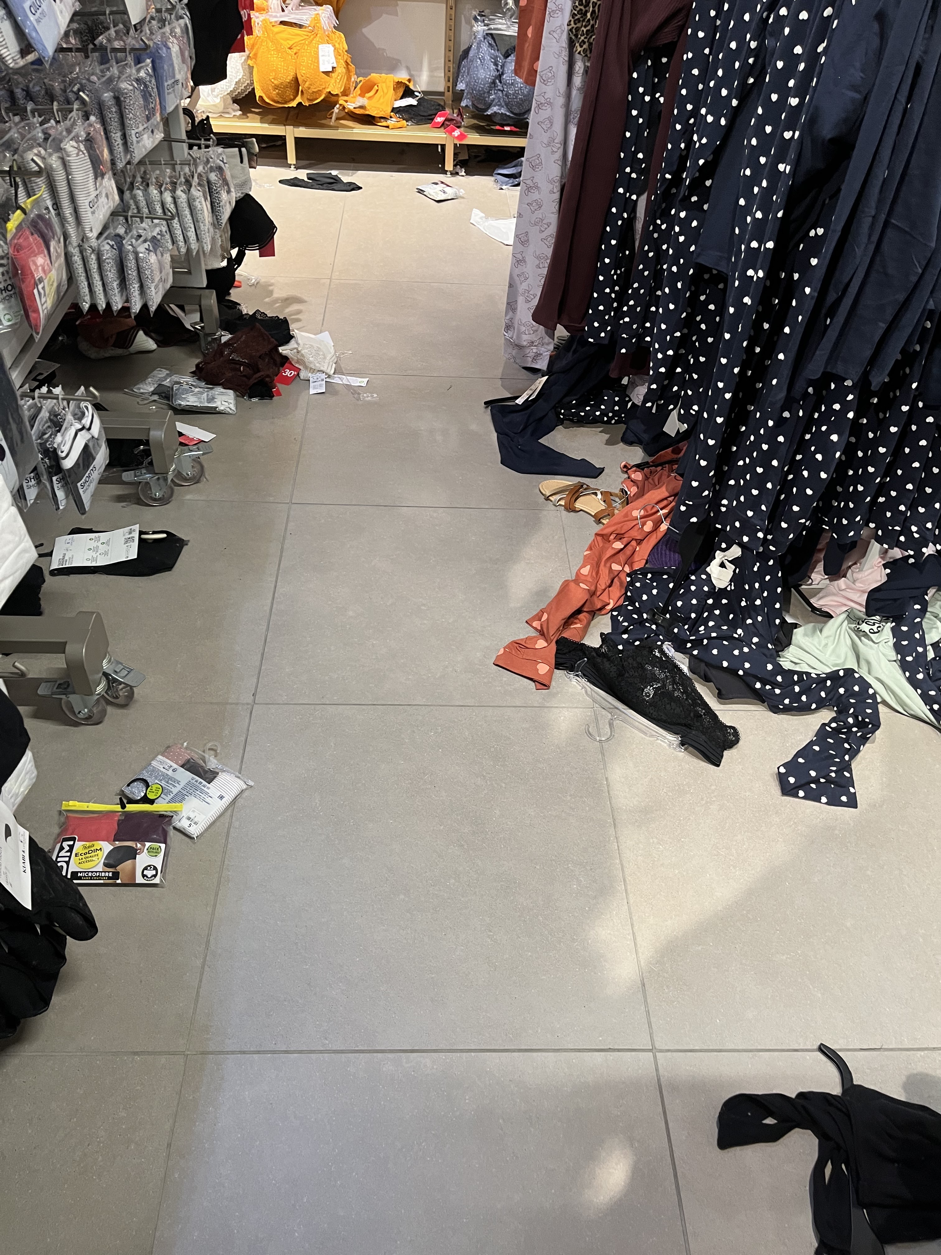 Rangement catastrophique au rayon des hommes Des vêtements et sous vêtements au sol Le rayon des jean's gros bazar !