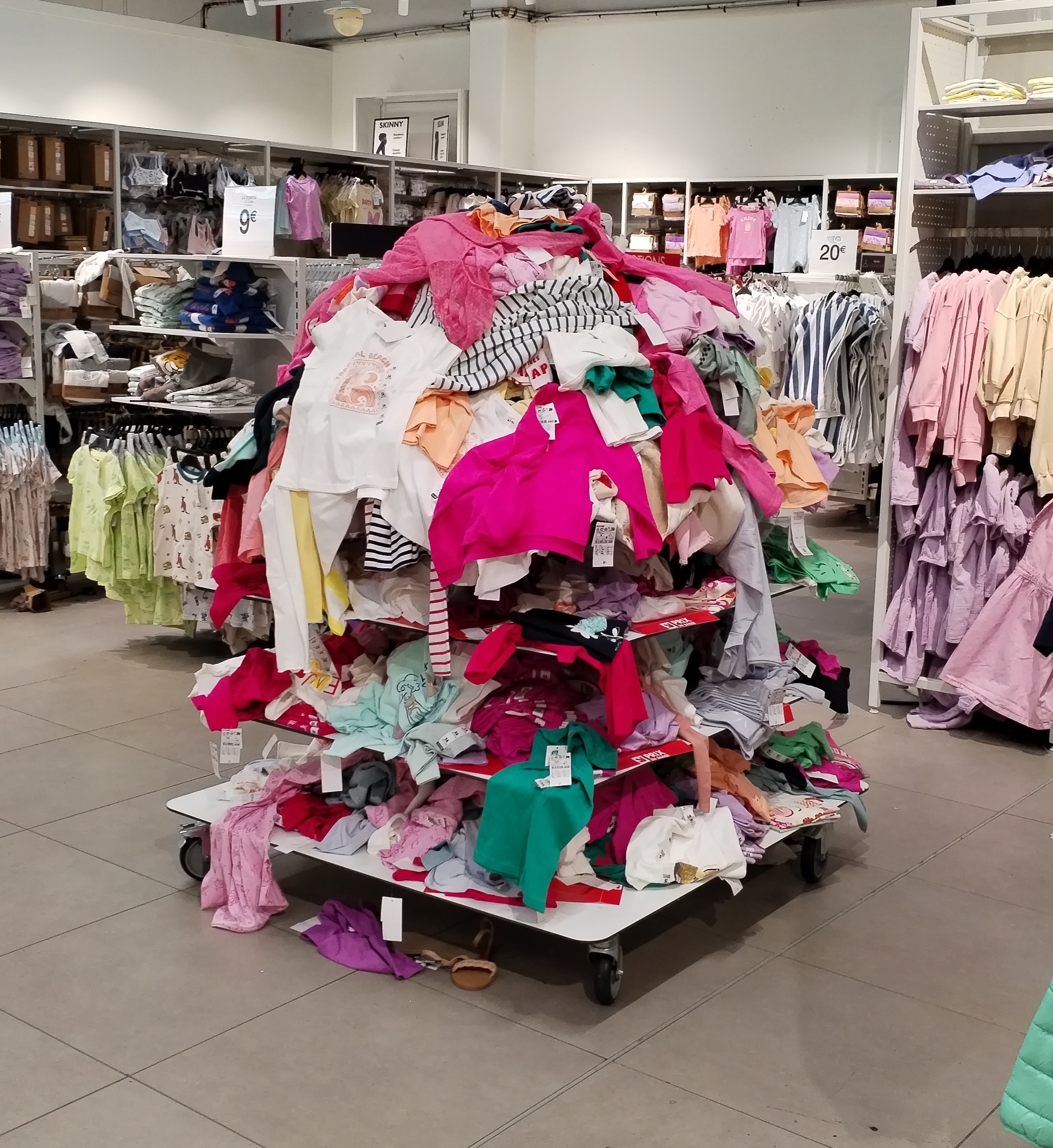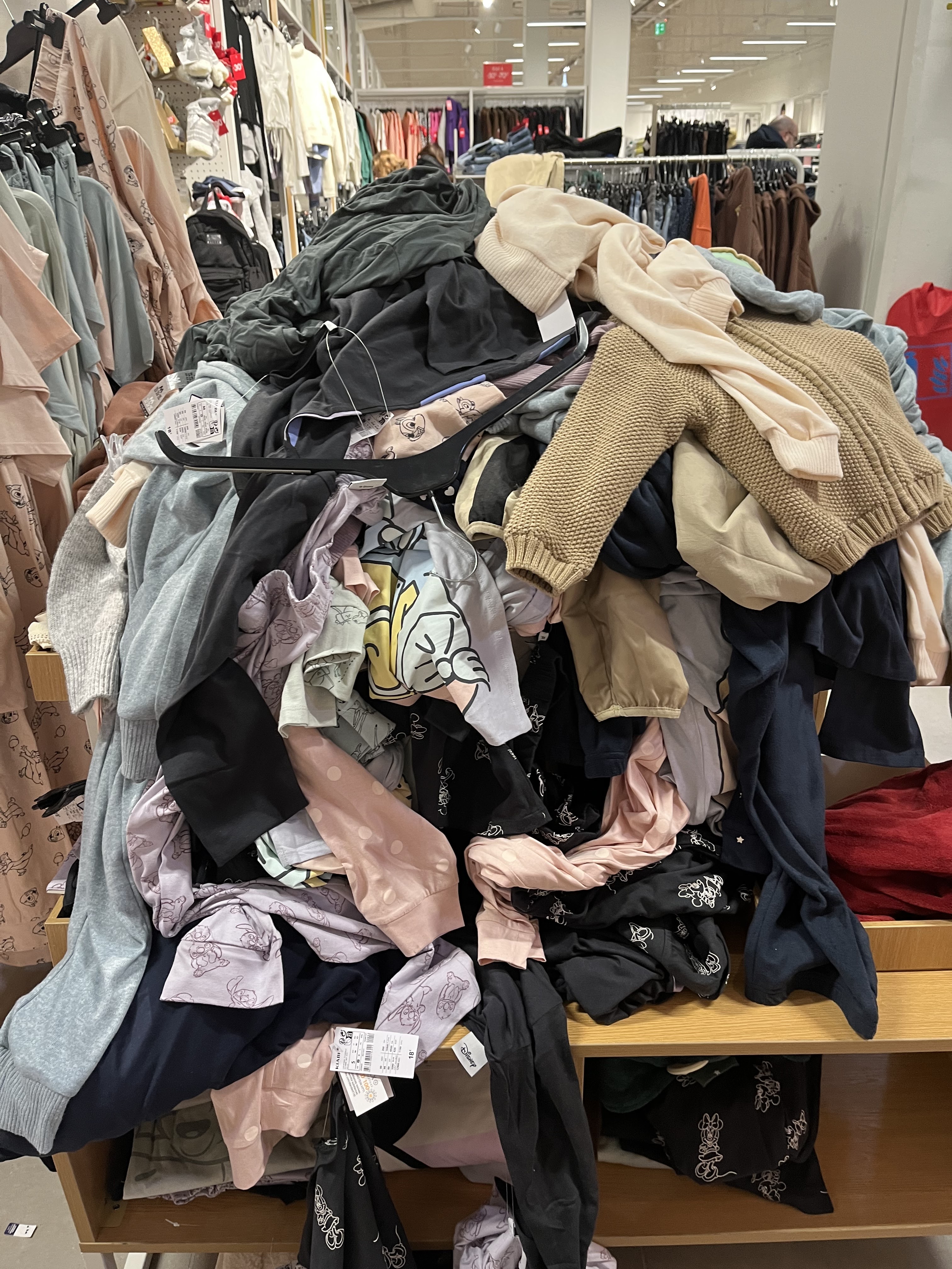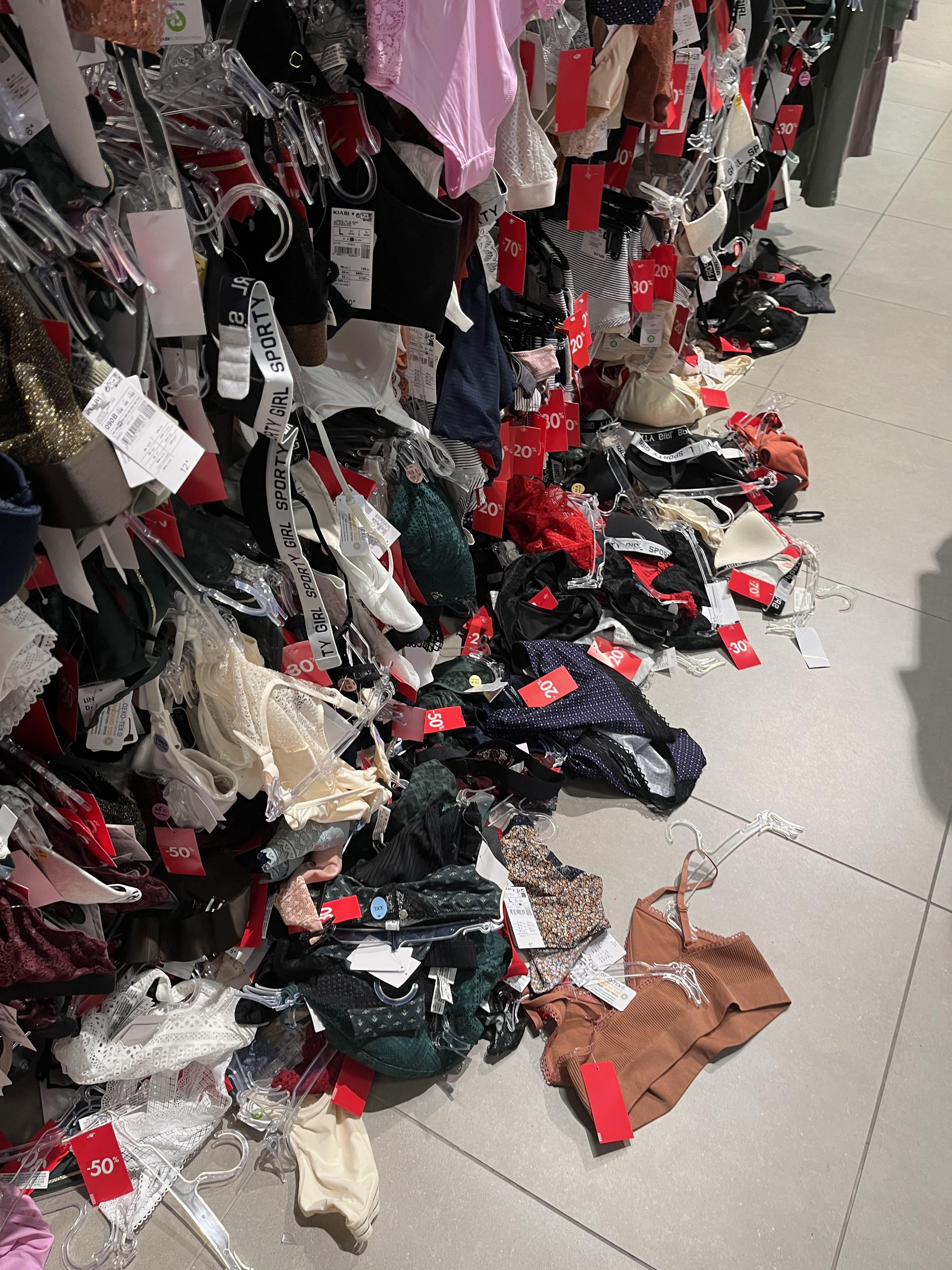 Rangement catastrophique au rayon des hommes Des vêtements et sous vêtements au sol Le rayon des jean's gros bazar !