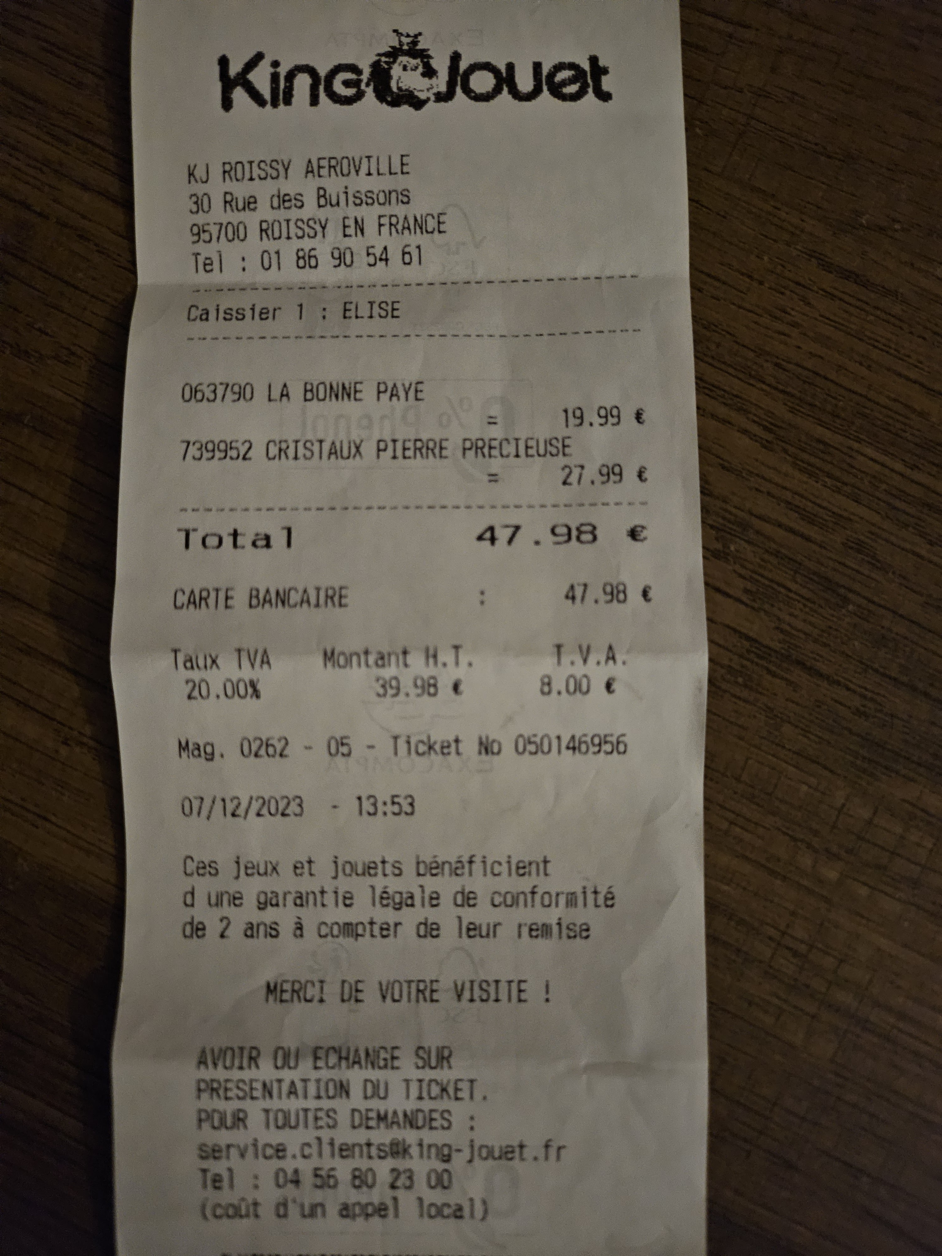 Veuillez vérifier attentivement l'état des jouets avant de payer. J'ai acheté une baguette Harry Potter aujourd'hui. J'ai fait d'autres courses à Aéroville ce jour-là. Quand je suis revenu à la voiture, mon fils a décidé de vérifier à quoi ressemblait son cadeau. Il s'avère que le couvercle de la batterie était cassé. Je suis retourné au magasin, où l'employé grossier du magasin a refusé d'accepter que le petit truc fermeture de la batterie est endommagé. Quand j'ai insisté sur le fait que je n'étais pas sûr que ce jouet fonctionnerait correctement, la même l'employé ma quitte et prendre cette baguette dans l'arrière-salle. Elle est revenue après environ 5 minutes avec les mots qu'elle a mis les piles et que la baguette d'Harry fonctionne correctement donc il n'y a rien d'autre qu'elle puisse faire et je ne peux pas le retourner au magasin car le jouet fonctionne bien. J'ai demandé une consultation avec le gérant du magasin, car le règlement stipule clairement que j'ai le droit de changer d'avis dans les 15 jours. La dame a dit que cela fait un mois depuis mon achat, donc je ne peux pas retourner le jouet défectueux. Quand j'ai fait remarquer que le reçu portait la date d'aujourd'hui, elle en fin appelé son superviseur. Le gérant du magasin a dit à son employée d'accepter le jouet défectueux et de me donner un bon pour de futurs achats, et comme les dommages ne sont pas visibles à l'œil nu apres petite réparation au magasin elle doit remettre le jouet sur l'étagère du magasin. J'espère qu'aucun enfant ne pleurera lorsqu'il recevra en cadeau un jouet endommagé remis en vente.