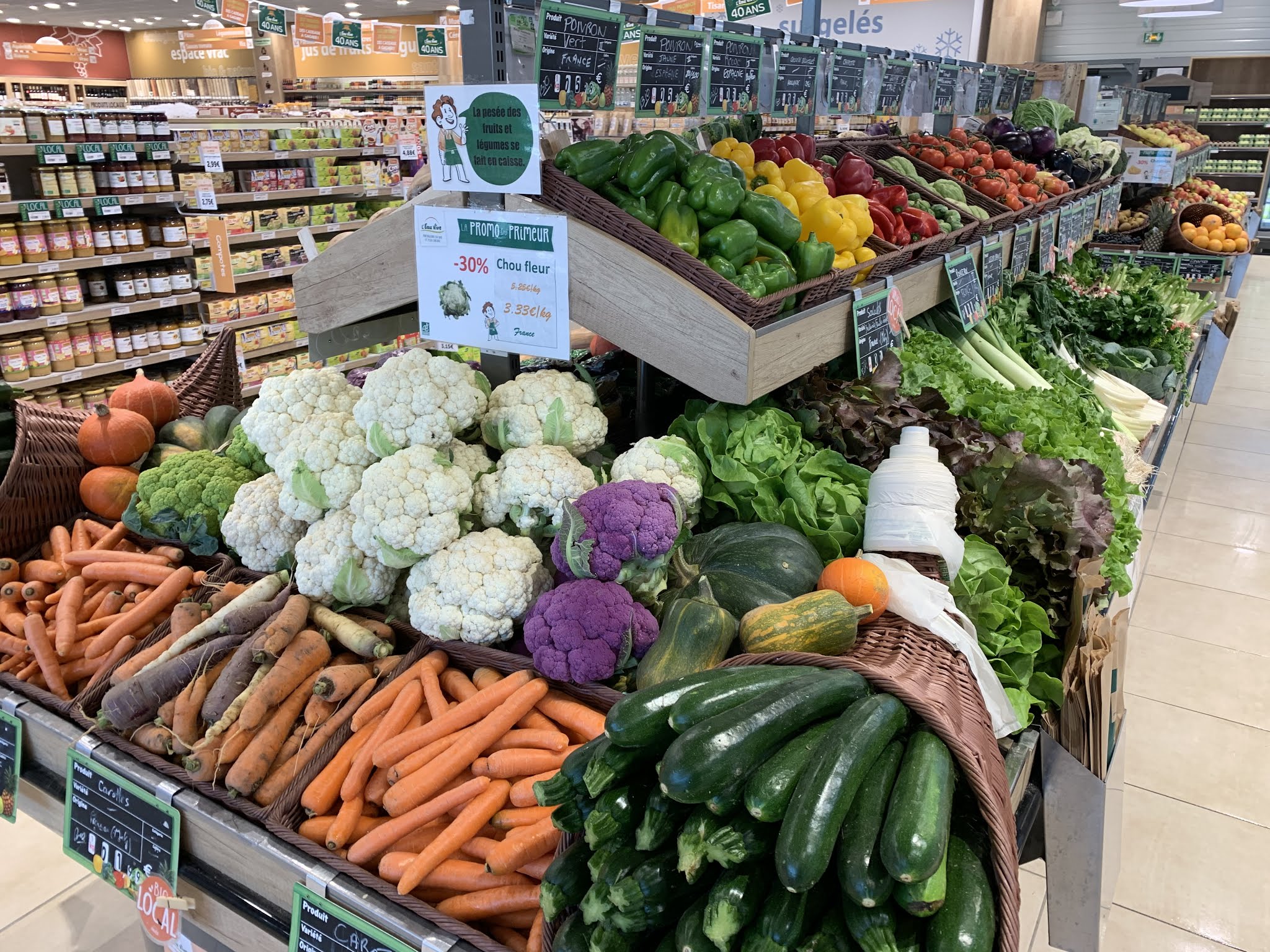 La gamme de produits bio est de plus en plus étendue et c'est très bien . Idem pour les vracs où le choix est très large . Seul bémol je n'ai pas trouvé la provenance des melons . Je venais de quitter un concurrent qui ne vendait que du melon espagnol ..!