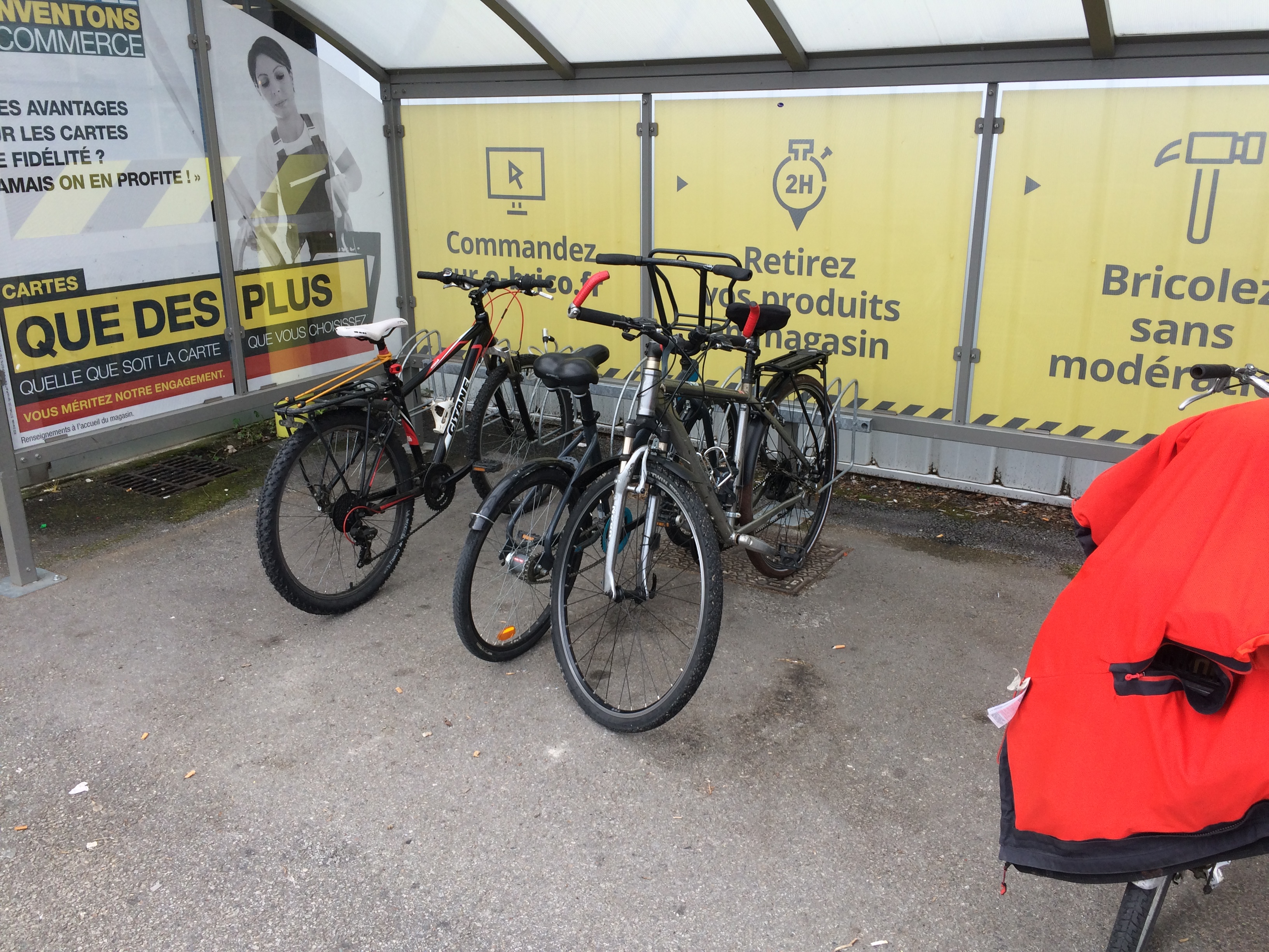 Pas d'arceaux pour sécuriser son vélo, uniquement 6 paires de pince roue (Qui garantit uniquement que votre roue sera là quand vous sortirez du magasin, pour le reste du vélo ça n'est jamais sûr)... Dommage car en tant que client régulier pour de petites et moyennes fournitures, j'y viens 90 % du temps à bicyclette depuis Grenoble, en empruntant la voie verte qui longe le Drac, (au besoin en tractant une remorque pour les articles encombrants) ... Je préférerais donc de vrais arceaux vélo, afin de pouvoir sécuriser le cadre et la roue avant avec un cadenas U . Seule méthode qui prémunit à peu près correctement contre le vol de vélo... Pour autant deux points positifs pour ceux qui y viennent à vélo : - eau à volonté et gratuite - climatisation rarement sous les 26degrés (peu de choc thermique en rentrant/sortant du magasin) . Pour le reste, je trouve généralement les choses standard dont j'ai besoin à l'entrepôt du bricolage . Pour les articles légèrement spécifique (vis chc m5x80, pourtant pas un truc foufou) il faut compléter avec d'autres enseignes ... Les vendeurs sont relativement disponibles et le conseil généralement adapté, les prix sont corrects .