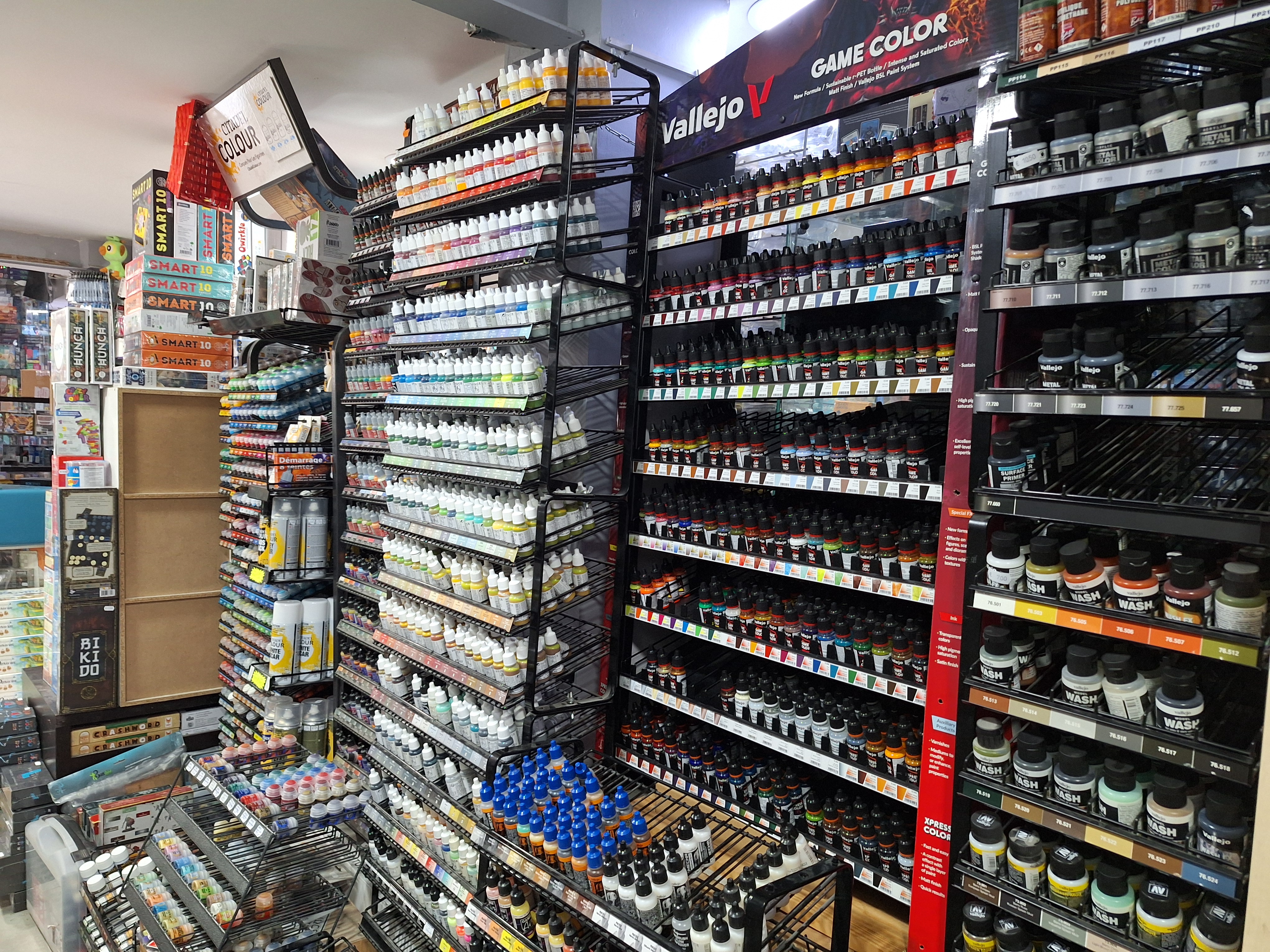 La boutique regorge de jeux de société, vous trouverez donc probablement ce dont vous avez besoin, ainsi que des couleurs pour les figurines, un petit coin brocante et à l'étage il y a aussi quelques tables pour jouer gratuitement :) un petit paradis des jeux de société