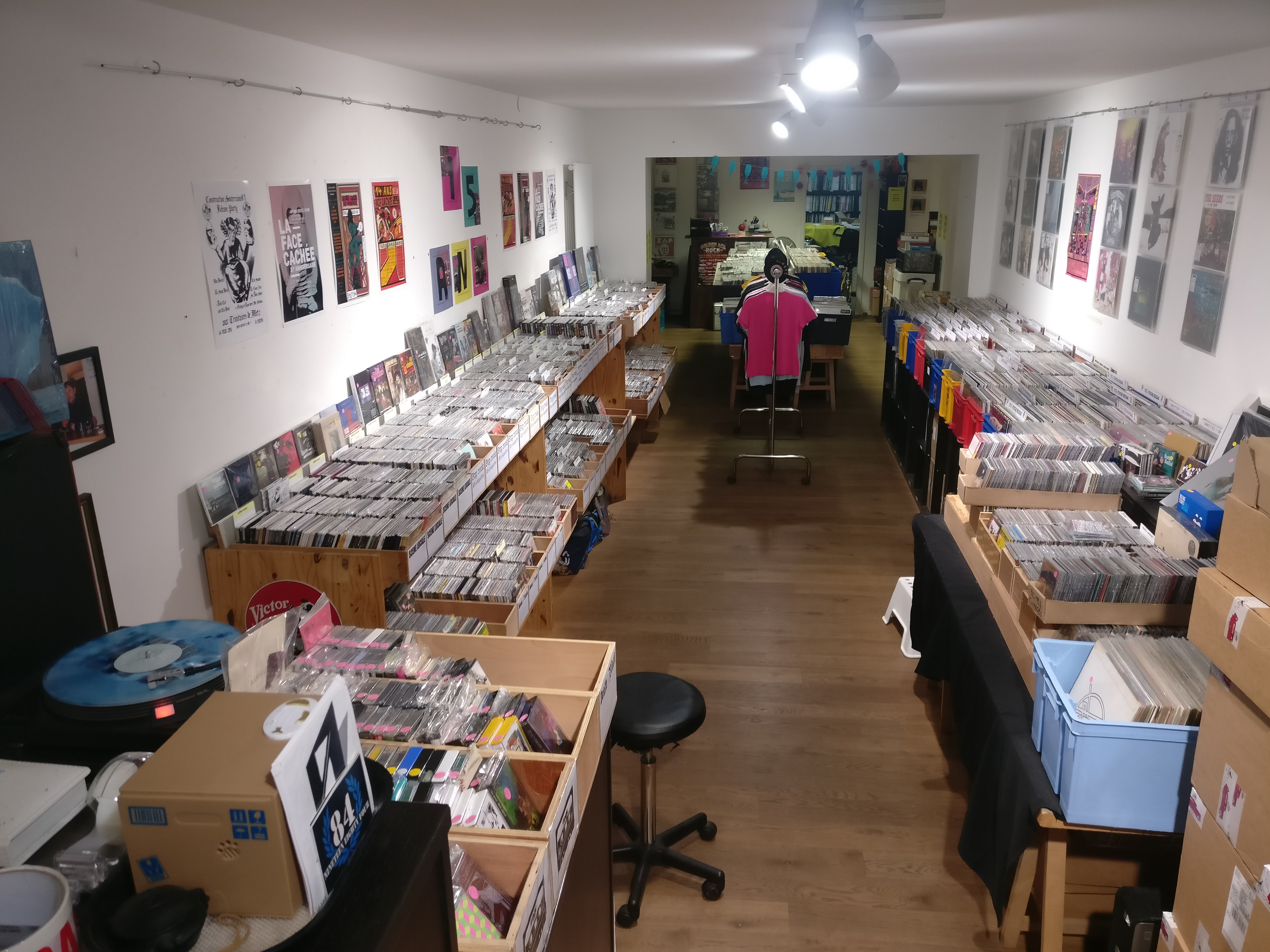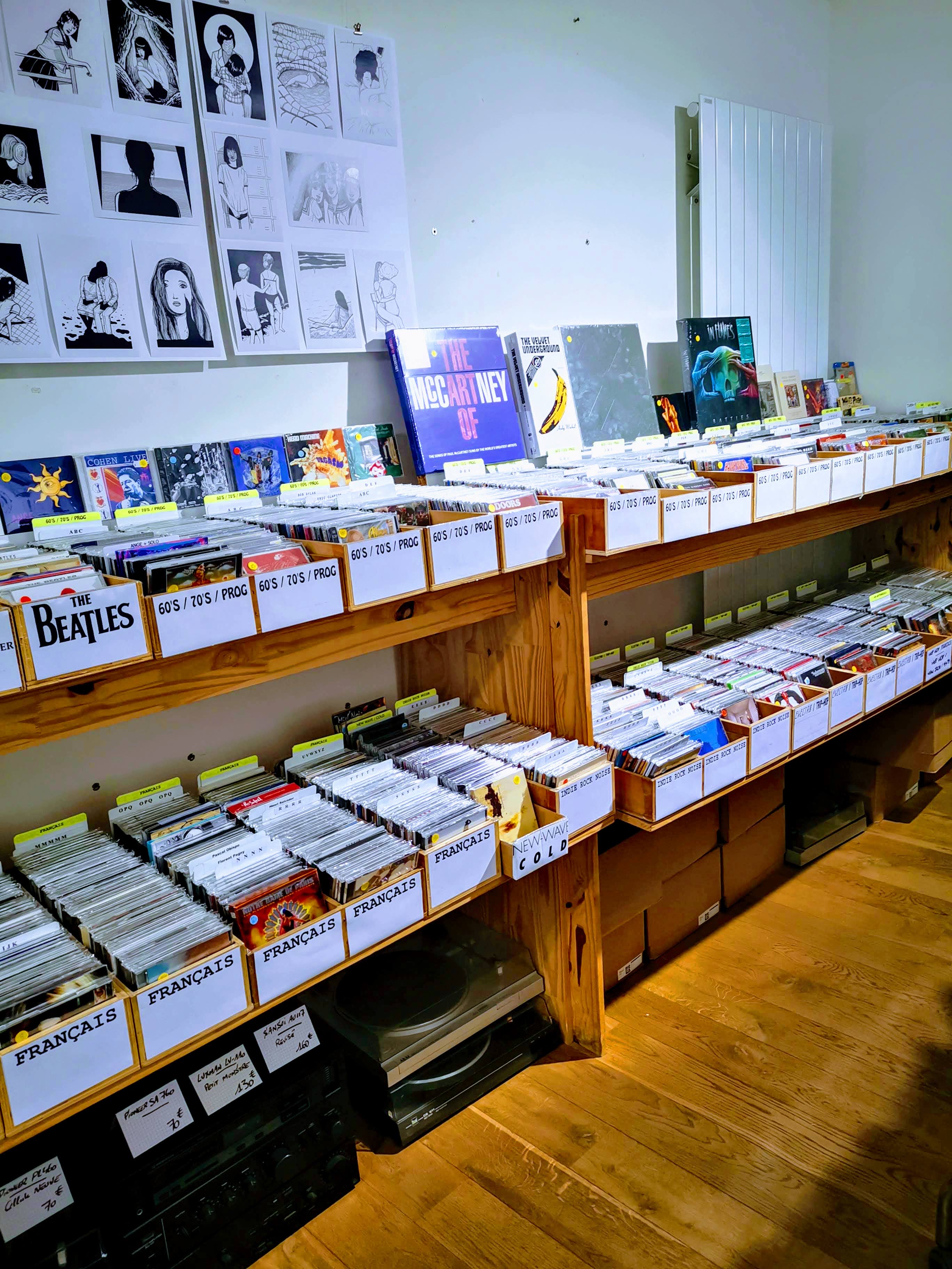Une grande sélection de vinyles classés avec soin. N'hésitez pas à lever la tête pour regarder quelqu'oeuvres graphique encadrées.