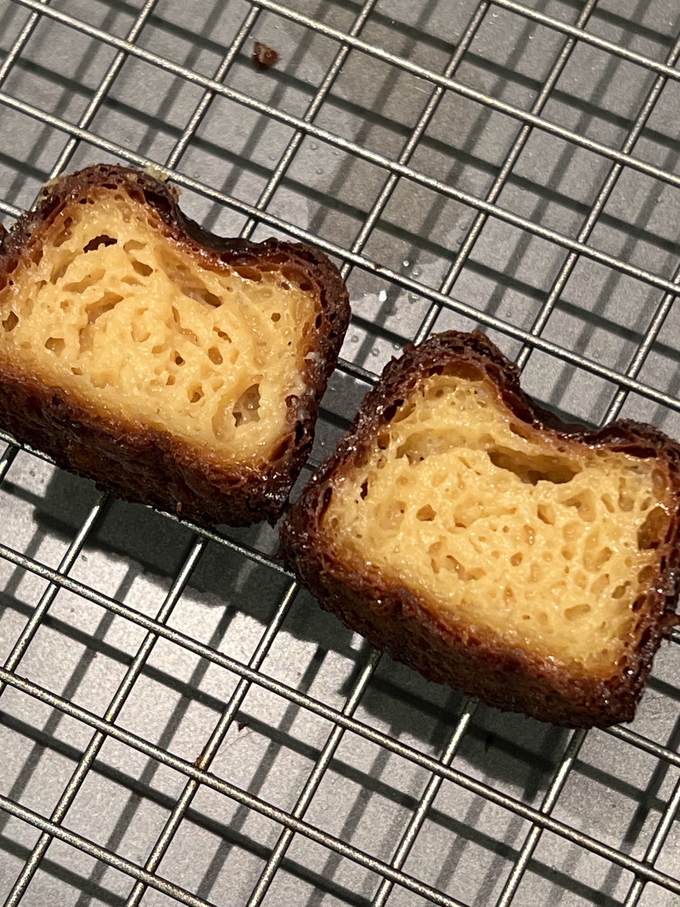 J'ai commandé 6 moules à Cannelé et l'huile de slider (huile blanche) un vendredi. Ma commande est arrivée lundi. J'avais préparé un lot de mélange à Cannelés et après avoir assaisonné les moules, j'ai cuit mes premiers sublimes Cannelés. J'aurais probablement pu remplir les moules un peu plus mais avec de nouveaux moules, je suis toujours plus prudent.
