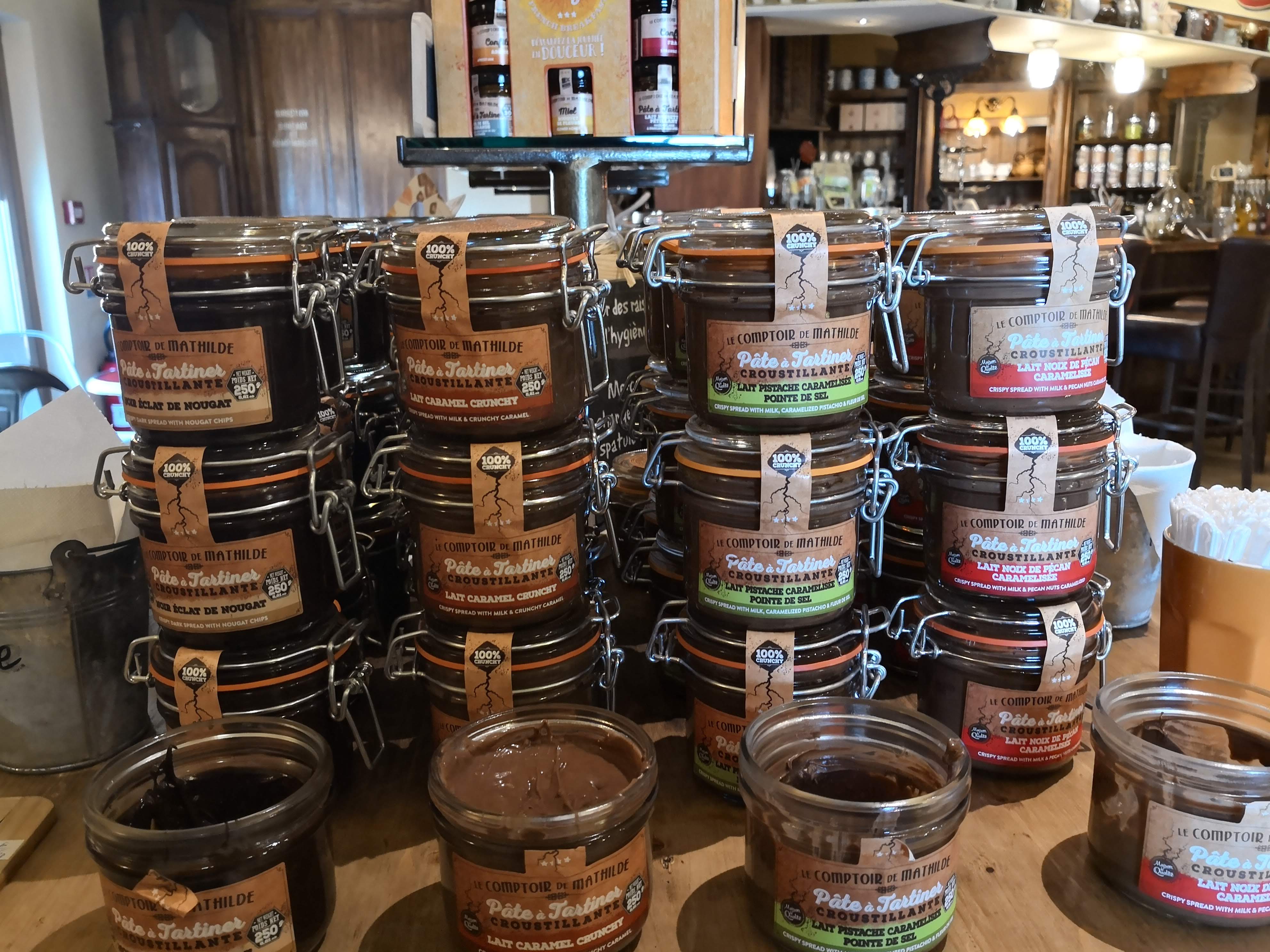 De superbes pâtes à tartiner, spéculoos, nougat chocolat noir, lait noisette à accompagner avec les crêpes. Un Délice ! Boutiques au top, on a envie de tout goûter, et un plaisir d'offrir, les tablettes à casser ou le chocolat à faire fondre dans une boisson chaude, les babas au rhum ou canalés.. Et j'en passe. 😁 🍫🍫