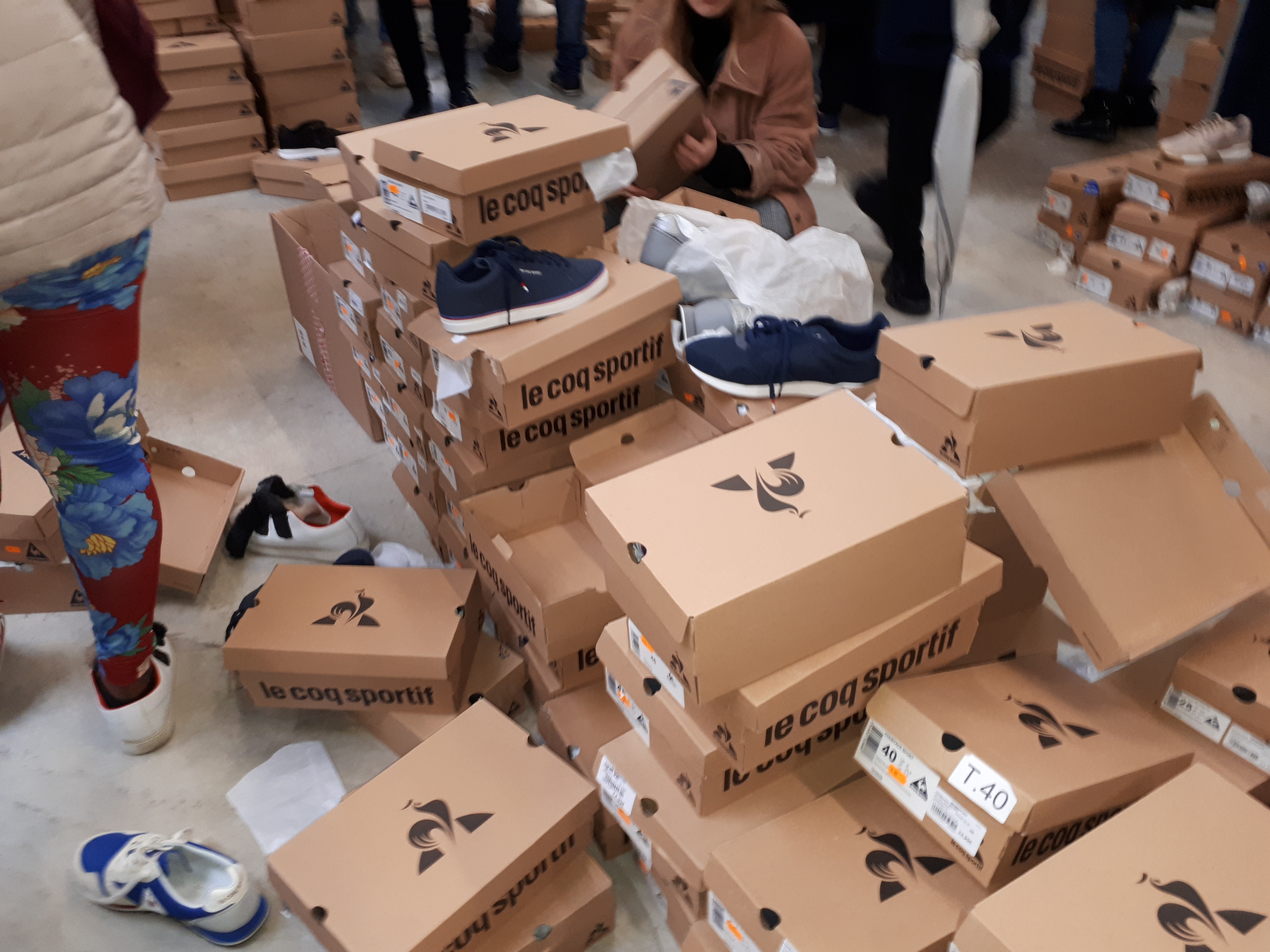 Un choix très étendu, notamment pour les baskets où toutes les tailles étaient bien représentées. Les paires de baskets se trouvaient rangées dans de très grands cartons.