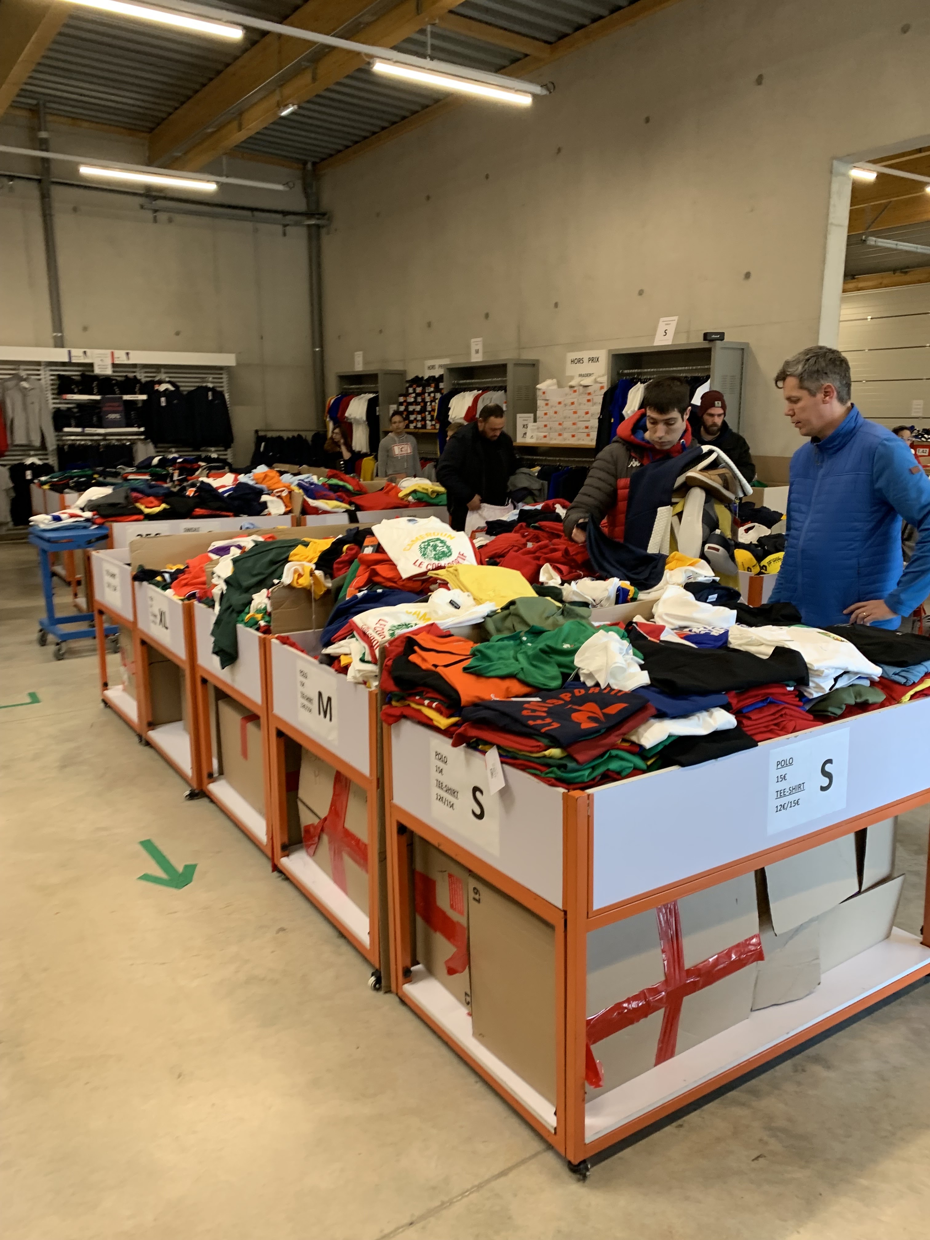 des cartons ouverts par taille et type de vêtement le tout exposé dans un hangar avec 2 parties' 1 pour les vêtements et l'autre pour les chaussures. démarqué intéressante au 1/3 du prix indiqué...a voir