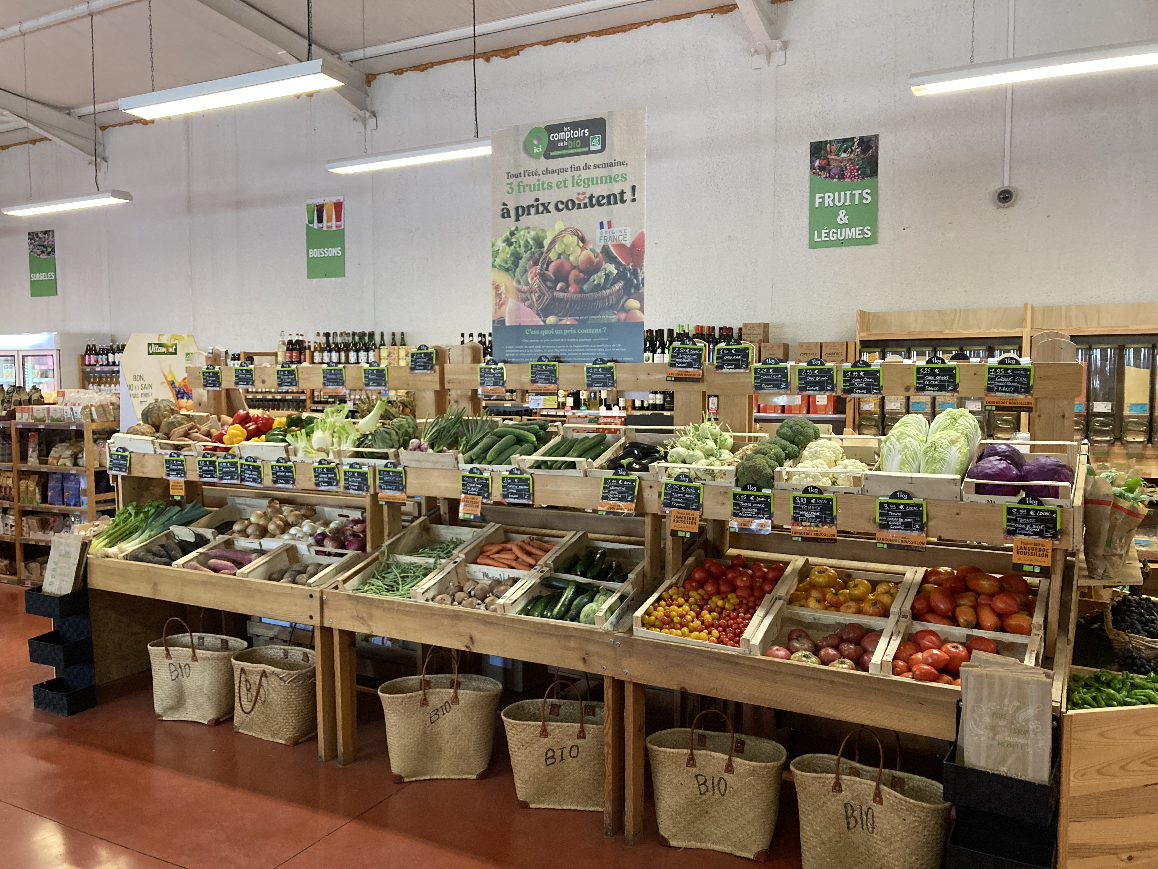 Produits en vrac, fruits et légumes de saisons, rayon produits laitiers frais et viande.