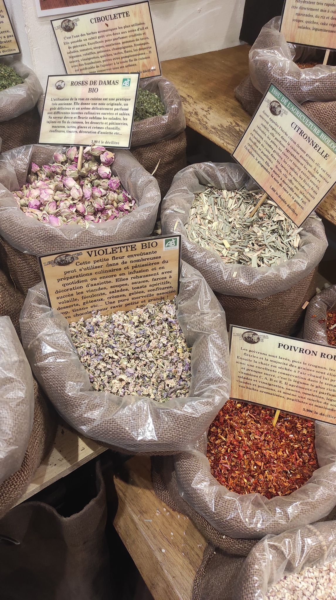 Un choix exceptionnel d’épices, herbes et aromates. Un vrai voyage dès que l’on pousse la porte. C’est aussi beau que cela sent bon !