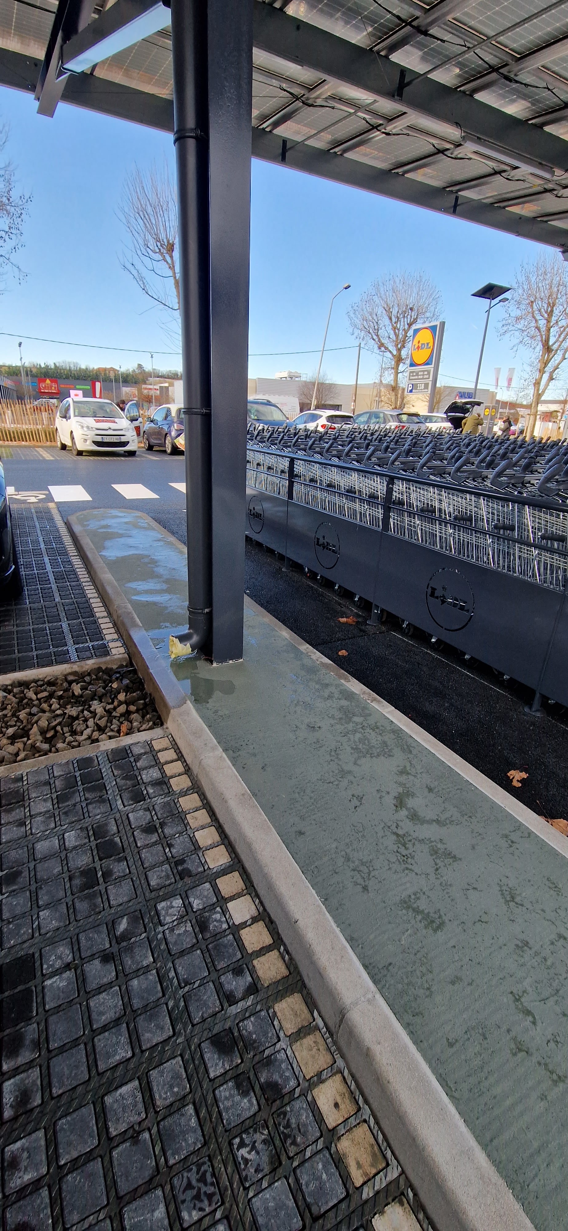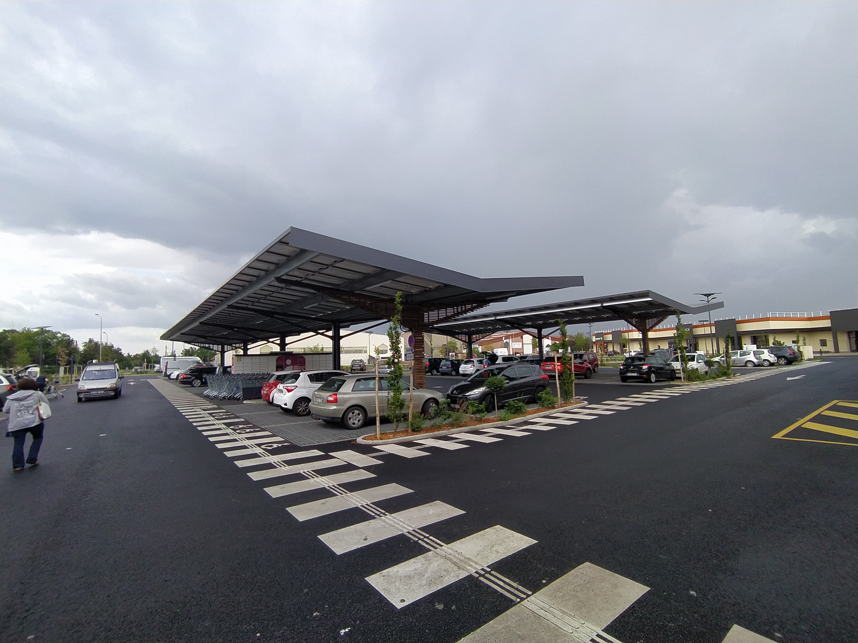 Grand magasin de style nouveau avec de nombreux parkings pour camping-cars. Le parking est couvert de panneaux solaires, ce qui est une excellente idée.