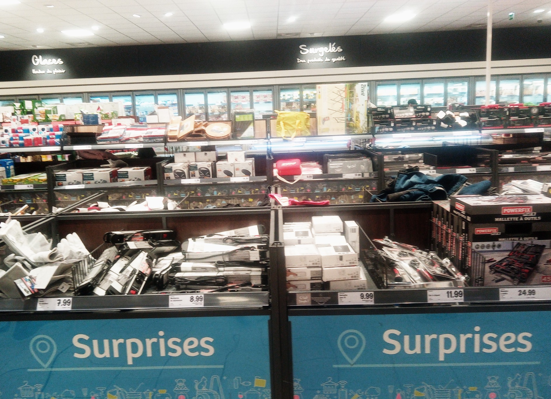 Très peu de choix (oubliez une grosse partie du ménager) et logique de rangement inexplicable (des outils au milieu des chaussures, le tout à côté de la nourriture surgelée.. mais qui a fait ça ?