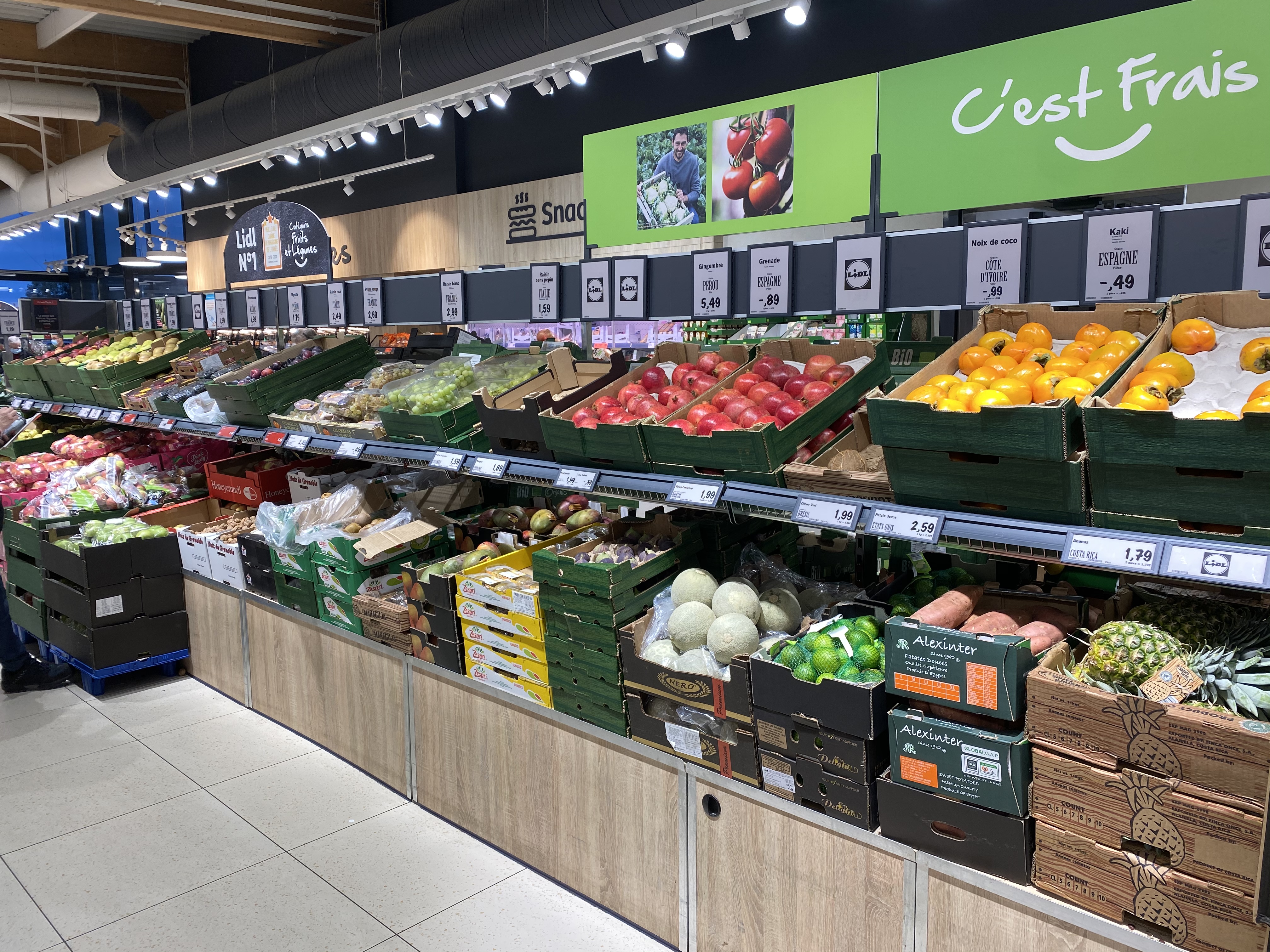 4 étoiles pour la qualité des fruits et légumes , un grand rayon très fourni le gros débit visiblement, car jamais vu de fruits „gâtés“ sinon , magasin prisé, neuf et bien situé. Un bémol : le passage priorité handicapé mériterait d être ouvert, au heures d ‚affluence qu on ne soit pas obligé d‘ameuter le magasin où se planter devant la caisse fermée pendant que tout le monde nous regarde. Nous avons tous besoin de discrétion. Les files d’attente sont parfois longues, même si les caissières sont très professionnelles , efficaces.