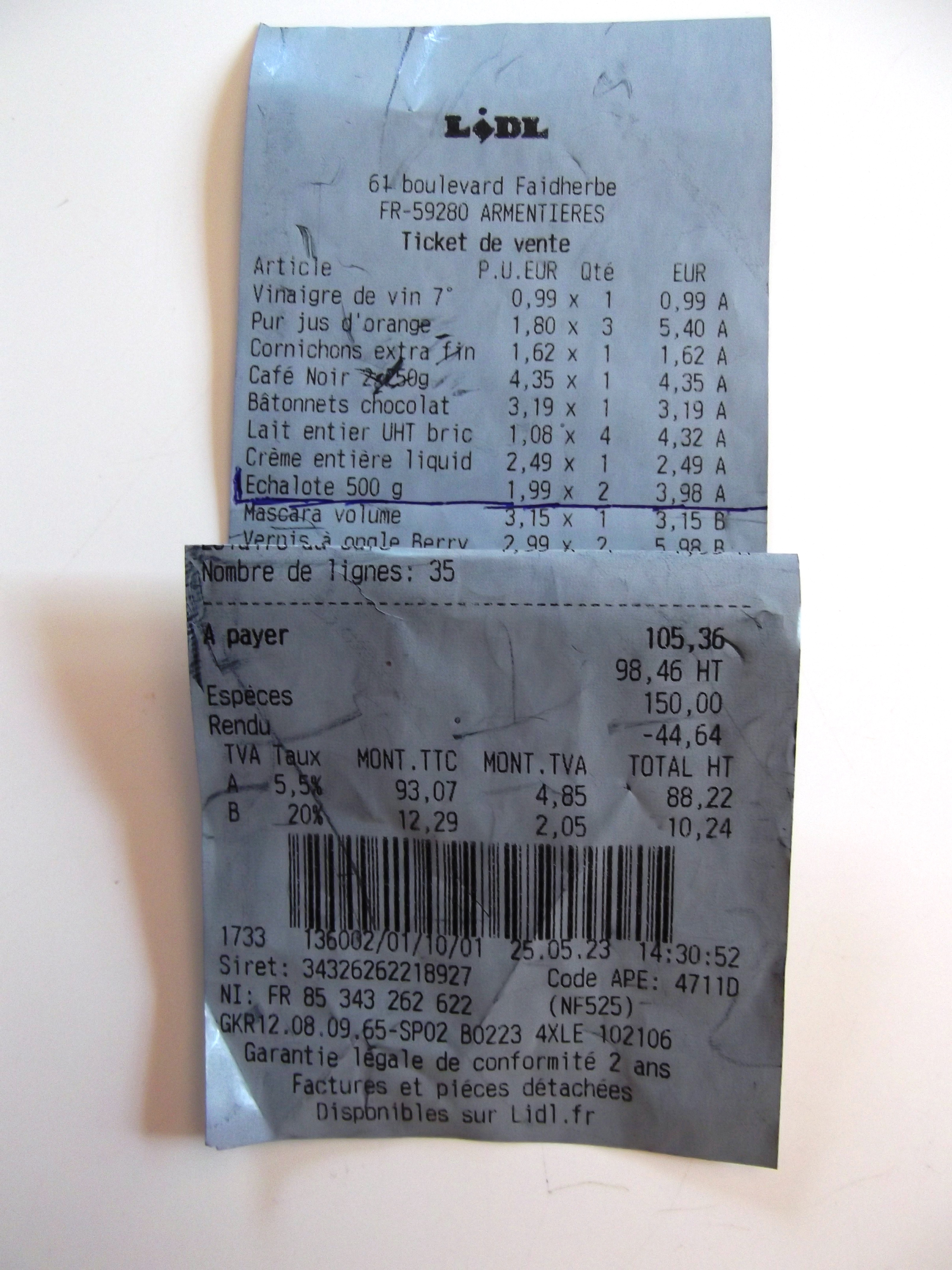 17.01.24 CONTROLER VOTRE TICKET DE CAISSE Une fois de plus différence à notre désavantage entre le prix affiché et le prix enregistré (bouteille jus de clémentine) 29.12.23 : H.A.Huitres 30.12.23 : Consommation huitres 31.12.23 : Gatro Suis-je le seul à avoir connu cette mésaventure ? Mai 2023 TROMPERIE sur catalogue Des échalotes affichées à 1.99 euro le kg se transforment. à 1.99 euro les 500 gr sur le ticket de caisse..(voir photos) Mars2023 TROMPERIE SUR LE POIDS J’ai constaté sur mes deux derniers achats de Maasdam des différences de poids : 392gr pour l’un et 394 pour l’autre pour un poids affiché de 400gr (voir photos). Soit un manque de 14gr => une différence de 1.75% difficilement acceptable. Ramené au niveau national, éventuellement international, ça fait du dégât ! Après signalement avec moulte justificatifs et relance (car restés sans réponse) au service clients Lindl conso, celui-ci m’a offert un bon de 5 euros… J’ai été tenté de signaler à « 60 millions de Consommateurs » auquel je suis abonné … Sont-ils intervenus auprès du producteur ; pas d’achat de Maasdam depuis je ne peux donc savoir si le poids est dorénavant correct. Un conseil : vérifiez le poids de vos achats. =============================================== Ont refusé de me rembourser une différence de prix minime (leur erreur d'affichage) sur ticket semaines précédentes, prétextant que je dois vérifier lors du passage immédiat en caisse même. Ce qui à mon avis risque de boucher les caisses et engendrer le mécontentement des clients suivants... Ce que je ferai donc lors de mon prochain passage en vérifiant les prix enregistrés sur l'écran avant de ramasser mes achats : désolé pour les clients qui seront derrière moi.