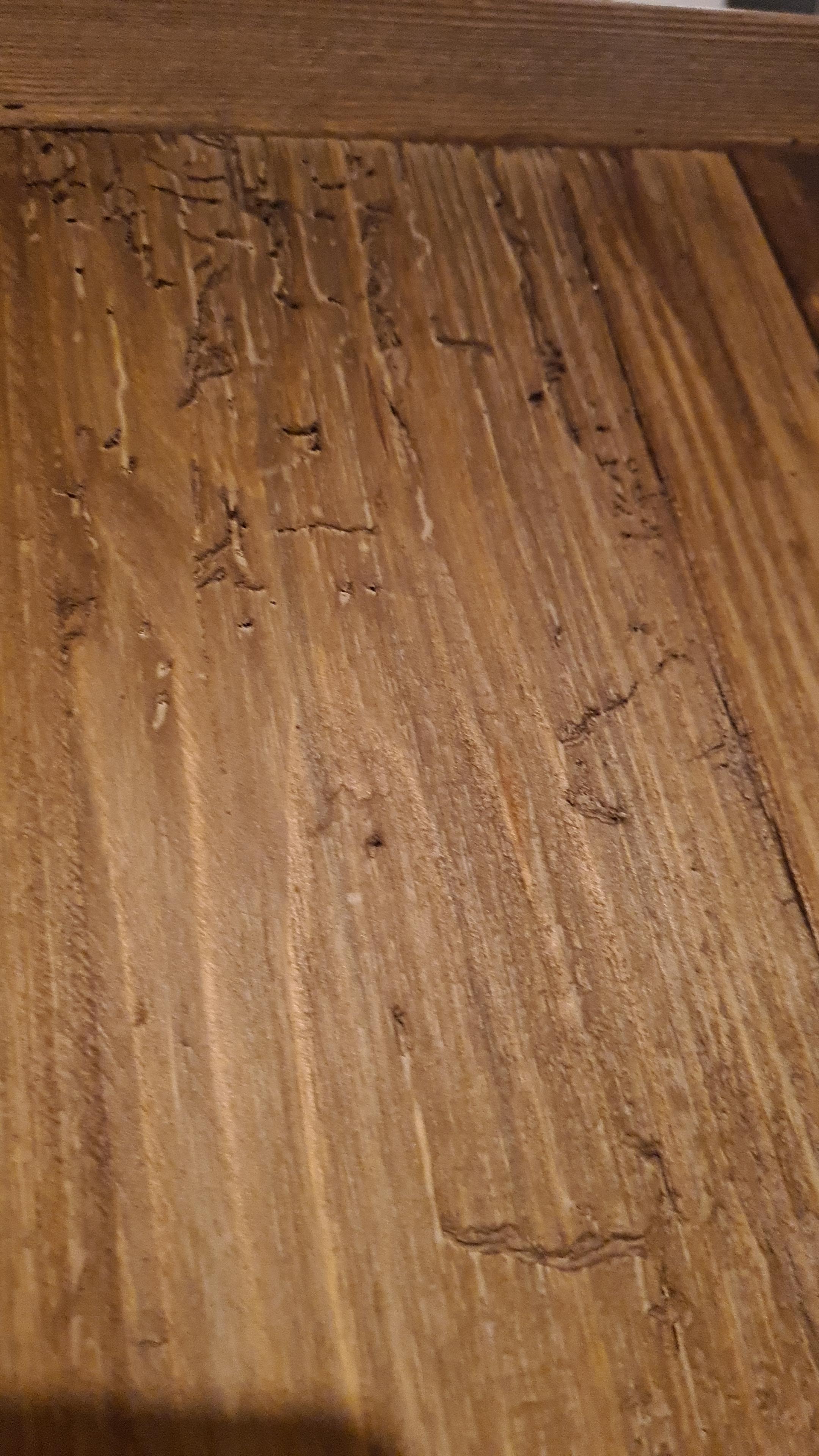 Table chene massif castelbay : attention structure en poudre de bois comme les autres ! Duree de vie 5 ans