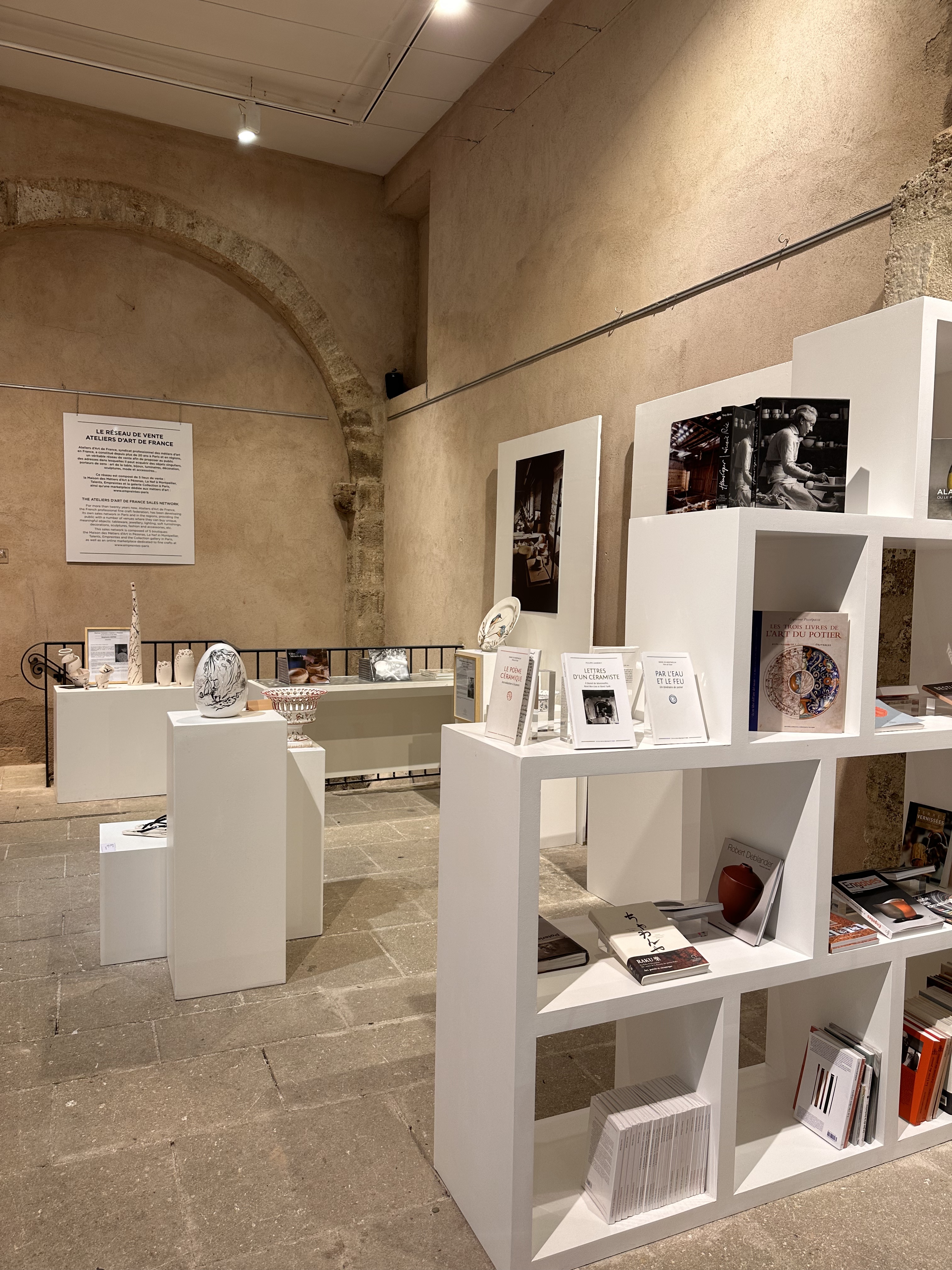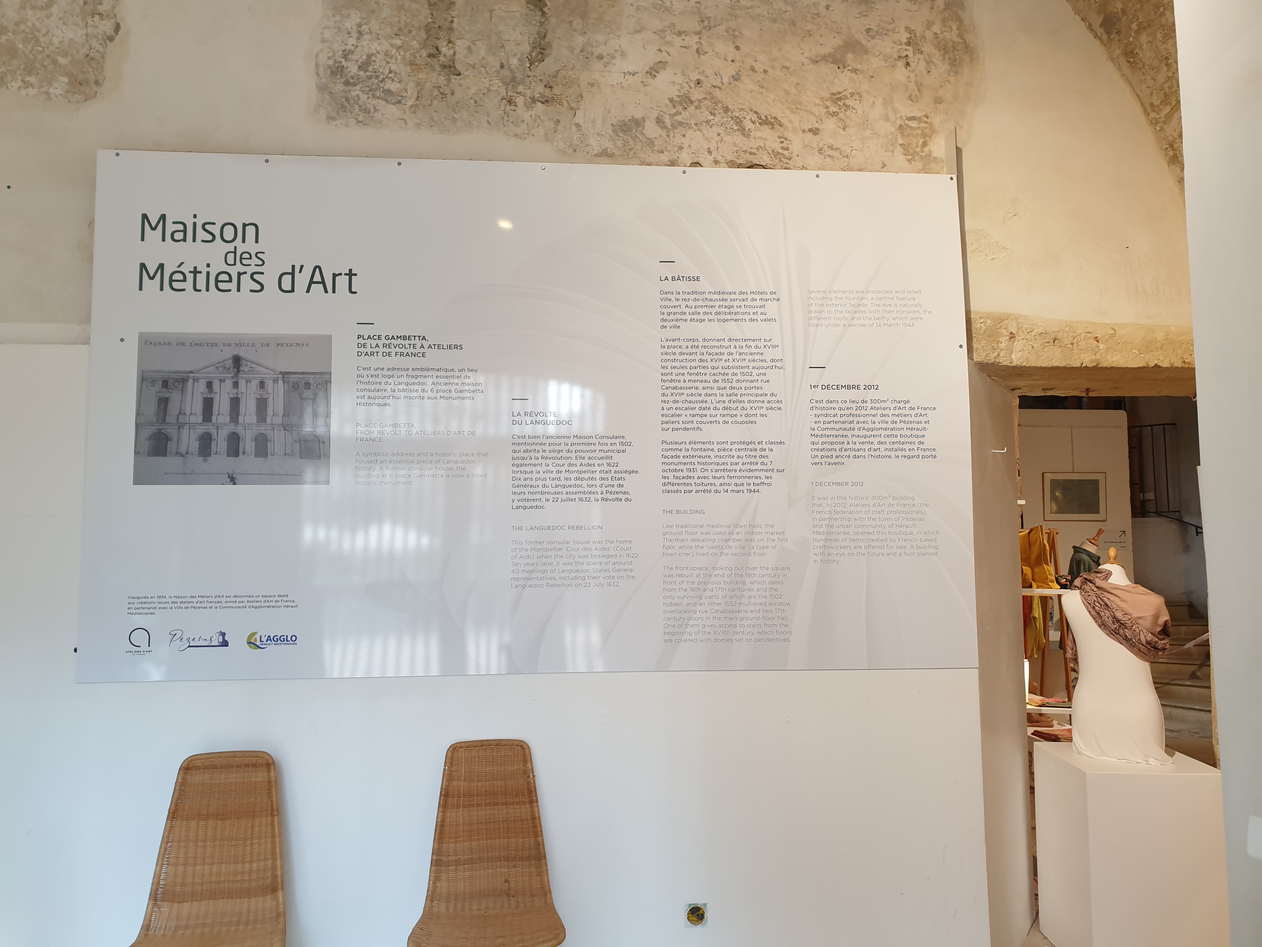 Un lieu incontournable de la ville où l'Artisanat Français est ici représenté à sa juste valeur. Les œuvres des Artisans sont ainsi exposées sur l'emblématique Place Gambetta, dans un grand bâtiment/boutique qui fut autrefois la Maison Consulaire de Pézenas, et qui est désormais classée aux Monuments Historiques Nationaux. On y trouve des pièces uniques, soigneusement réalisées à la main dans un grand espace d'exposition. Toutes les techniques de créations y sont abordées, selon le savoir-faire de chaques métiers artistiques, vous y trouverez des objets déco en céramique, cuir, papier, fer, porcelaine, etc... Des bijoux, sculptures, arts de la table, accessoires de mode, mobiliers, articles de décoration divers et variés... Un univers précieux, délicat et poétique s'offre à vous. Les salles sont grandes et lumineuses, il y a tellement de choses exposées que l'on ne sait où regarder. Attention aux sacs, quand vous circulez entre les grandes tables, l'espace y est restreint et un accident peut vite arriver ! À noter que l'on peut également acheter les objets présentés, mais les prix restent très peu abordables. Cela donne néanmoins un avant-goût de l'Artisanat, qui est très bien représenté dans les Ateliers, présents dans les ruelles tout autour. Alors si vous aimez l'atmosphère qui se dégage de cette exposition, n'hésitez pas à poursuivre votre route et partir à la découverte des métiers d'arts présents dans toute la ville, vous y ferez certainement de très belles rencontres, et trouverez en direct des articles, à des prix beaucoup plus attractifs !