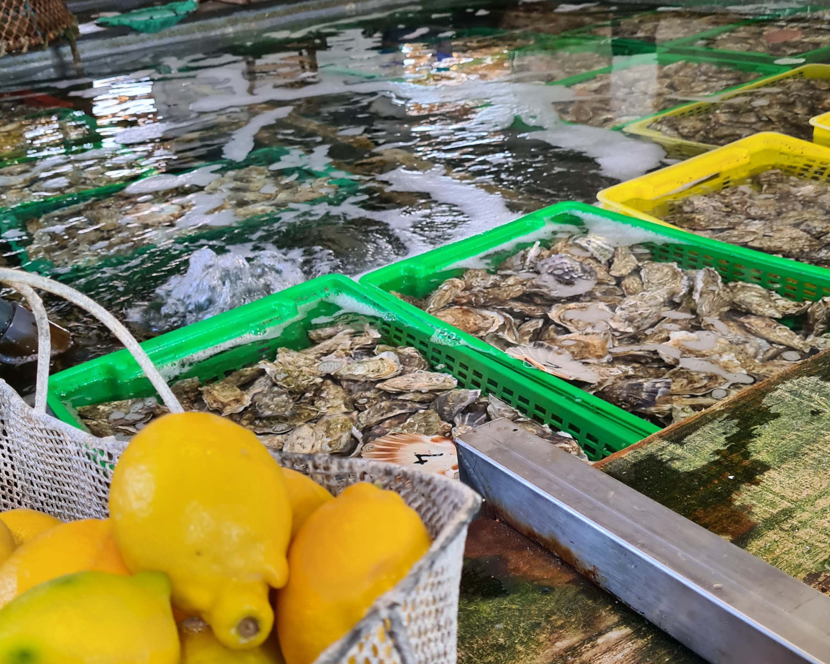 Tres bel etalage de fruits de mer ! Des huîtres en pleine nage dans le bassin derrière, La qualité est vraiment au rendez vous !!