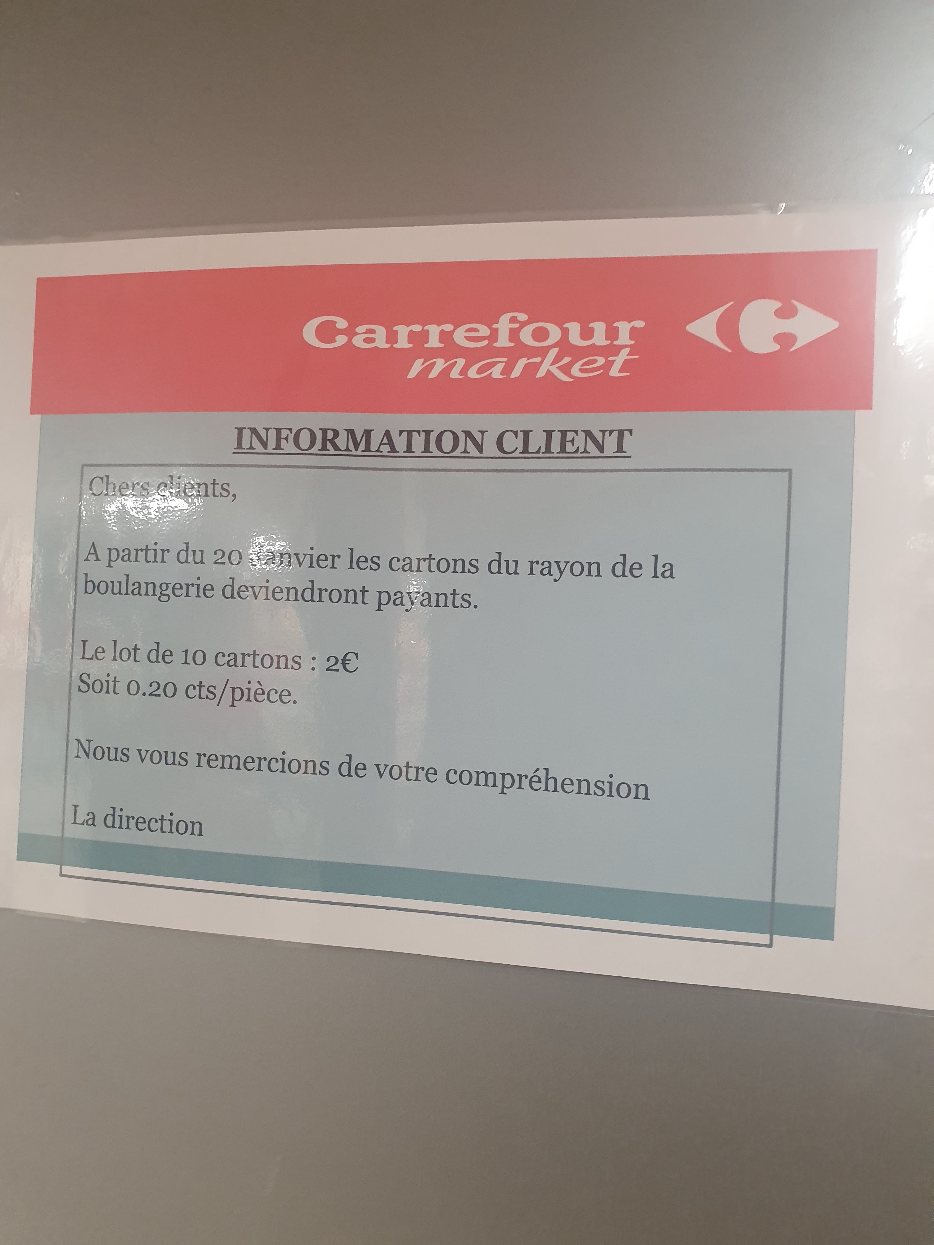 Ils vendent même du carton pour de l'argent. ils le jettent dans le broyeur mais ils les vendent au client pour de l'argent. J'ai demandé une boîte d chips de l'une du employé. Elle m'a dit no et elle m'a envoyé au boulangerie pour payer pour des cartons. Quand je les ai pris la dame qui travaille là-bas m'a dit maintenant vous allez payer et elle m'a donne une petite feuille Depuis le 20 janvier, cette règle est appliquée. Je travaille aussi dans un carrefour market, on n'est pas payé ou quoi que ce soit. Nous donnons les gratuitement. C'est vraiment choquant!