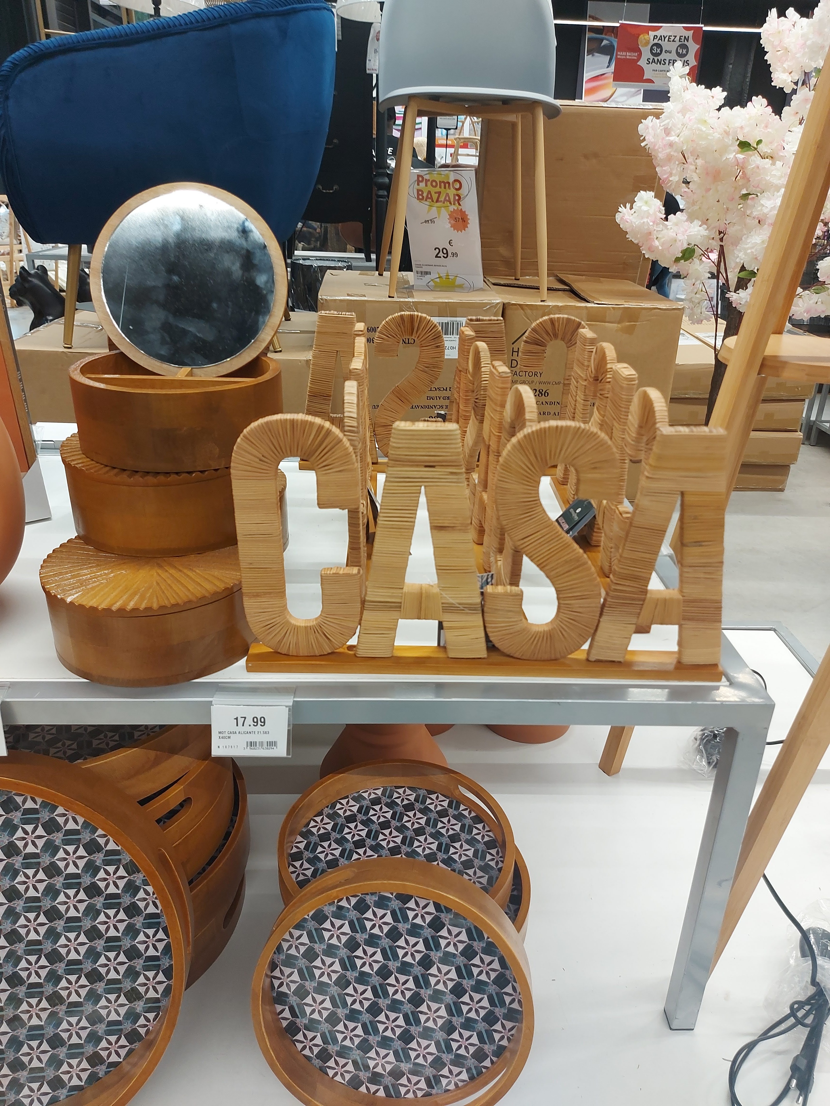 Je recommande fortement maxi bazar du shopping promenade l'acceuil le sourire des vendeuse et le large choix des produits a des prix raisonnables franchement je suis ravie j'ai pu meubler masalle de bain et mes toilettes c'est trop jolie avec certains meubles de chez eux on m'a même proposer de me les apporter à ma voiture ce qui a été le cas car javai un bébé avec la poussette franchement merci pour votre service je reviendrais😁