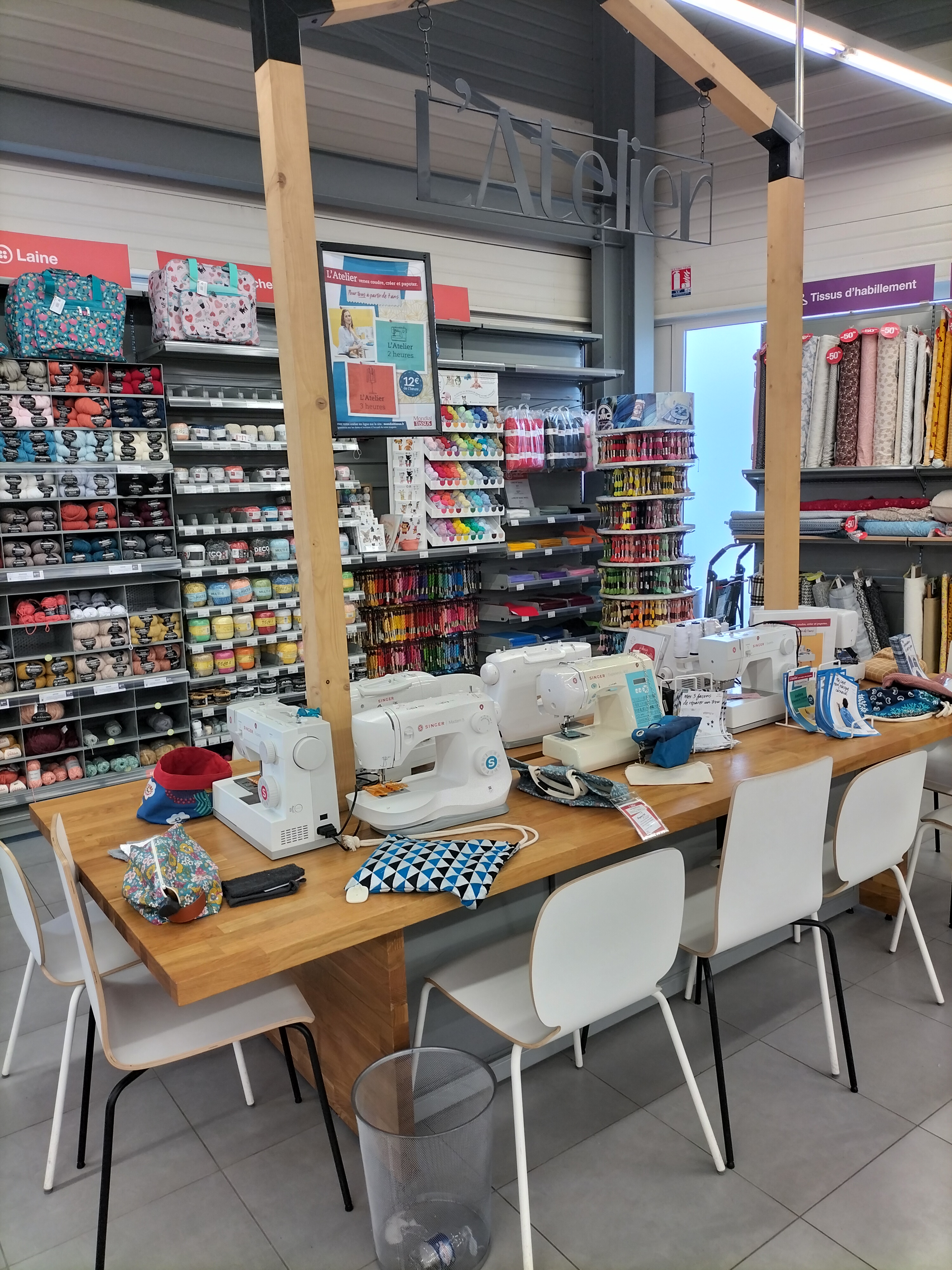 Très grand choix de tissus, de matériels de mercerie, tricot, couture, mercerie, tapisserie. On y vend aussi des machines à coudre et surjetteuses. Pas de rouleaux de mousse, mais quelques choix de mousse prédécoupée pour les assises de chaises. Plusieurs choix de rembourrage pour coussins par contre. Je recommande l'atelier couture le mercredi pour les enfants et le samedi pour les adultes pour 10 euros par heure et max 3h. Les vendeuses sont sympathiques et la prof de couture est très abordable, explique et conseille bien. On dispose des machines à coudre mais on peut amener notre tissu et nos fils, etc, si on a tout ce qu'il faut. Moment de partage aussi avec les autres apprentis !