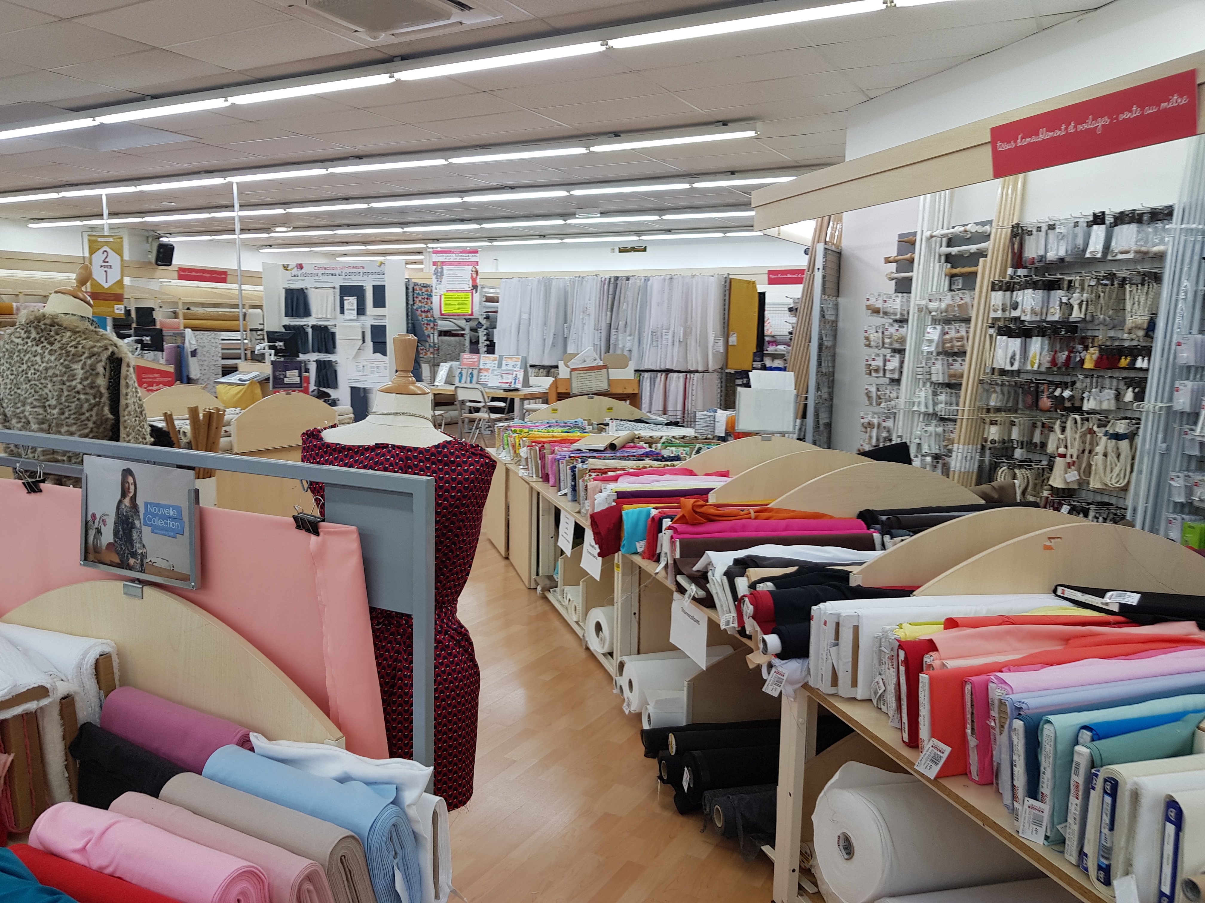 Très satisfaite énormément de choix pour les tissus. Tout pour la couture (mannequin réglable, fils,aiguilles, laines, fil pour broderies etc ...) accessoires pour rideaux entre d'autres choses encore . J'y retournerai .