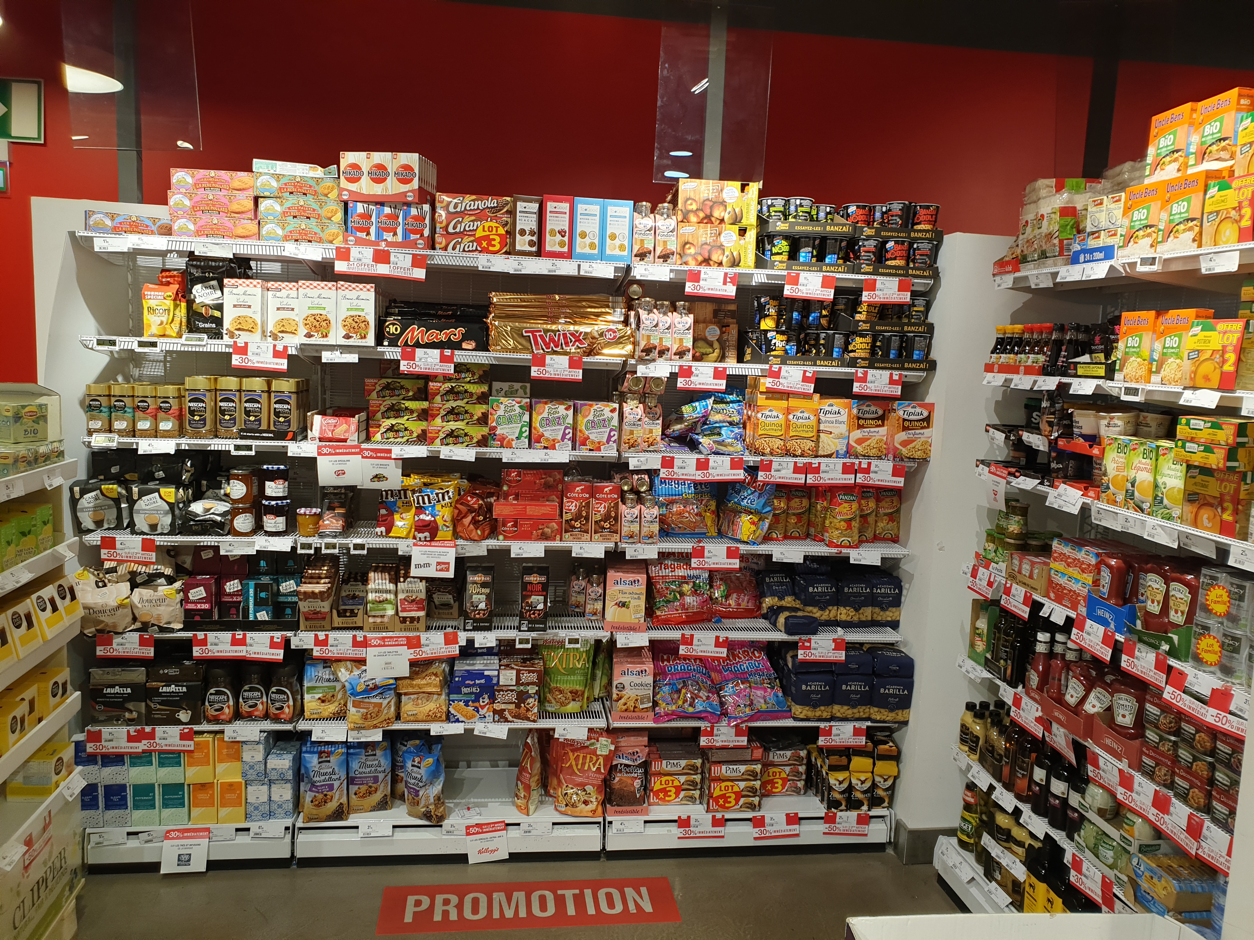 Joli supermarché français en centre ville. Il y a des vêtements à l'étage inférieur. L'étage supérieur est un supermarché avec un rayon décoration. Il existe de nombreux aliments non périssables, ainsi que des étagères réfrigérées contenant du fromage et de la viande.