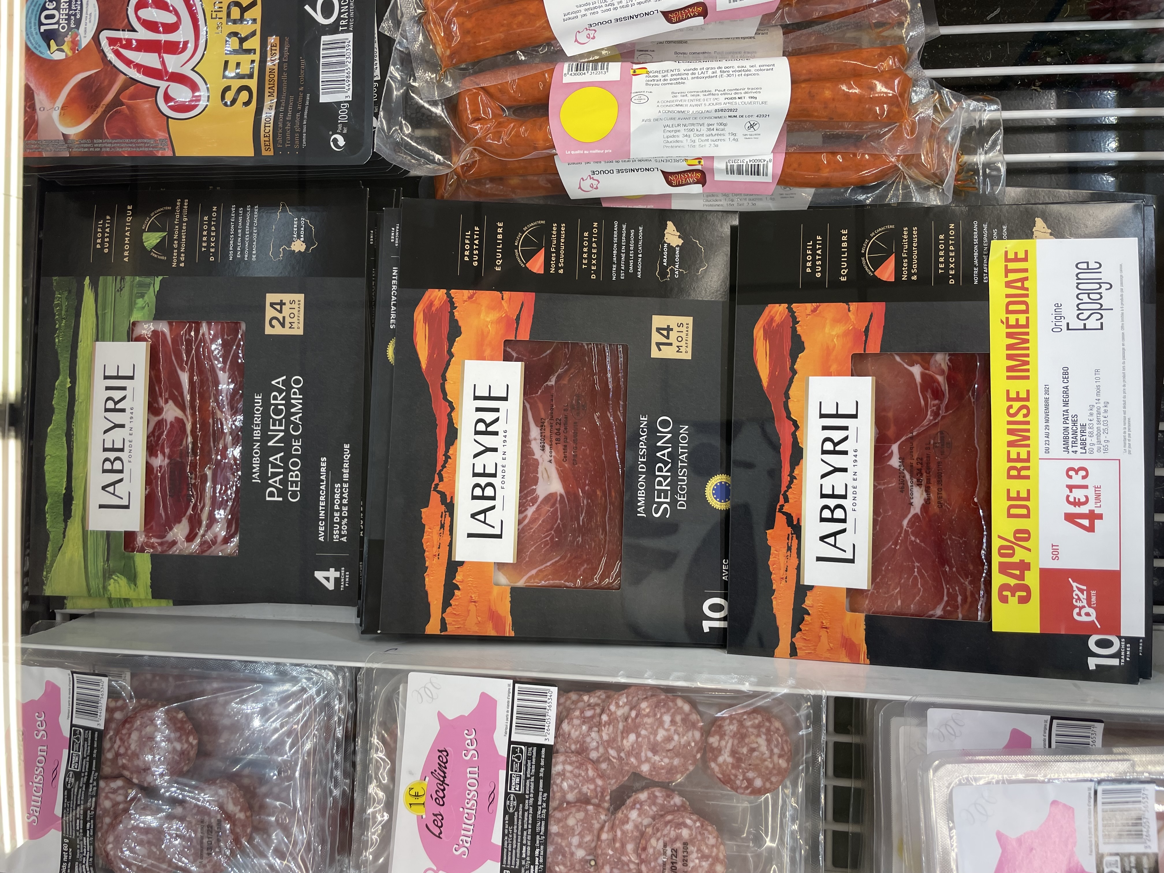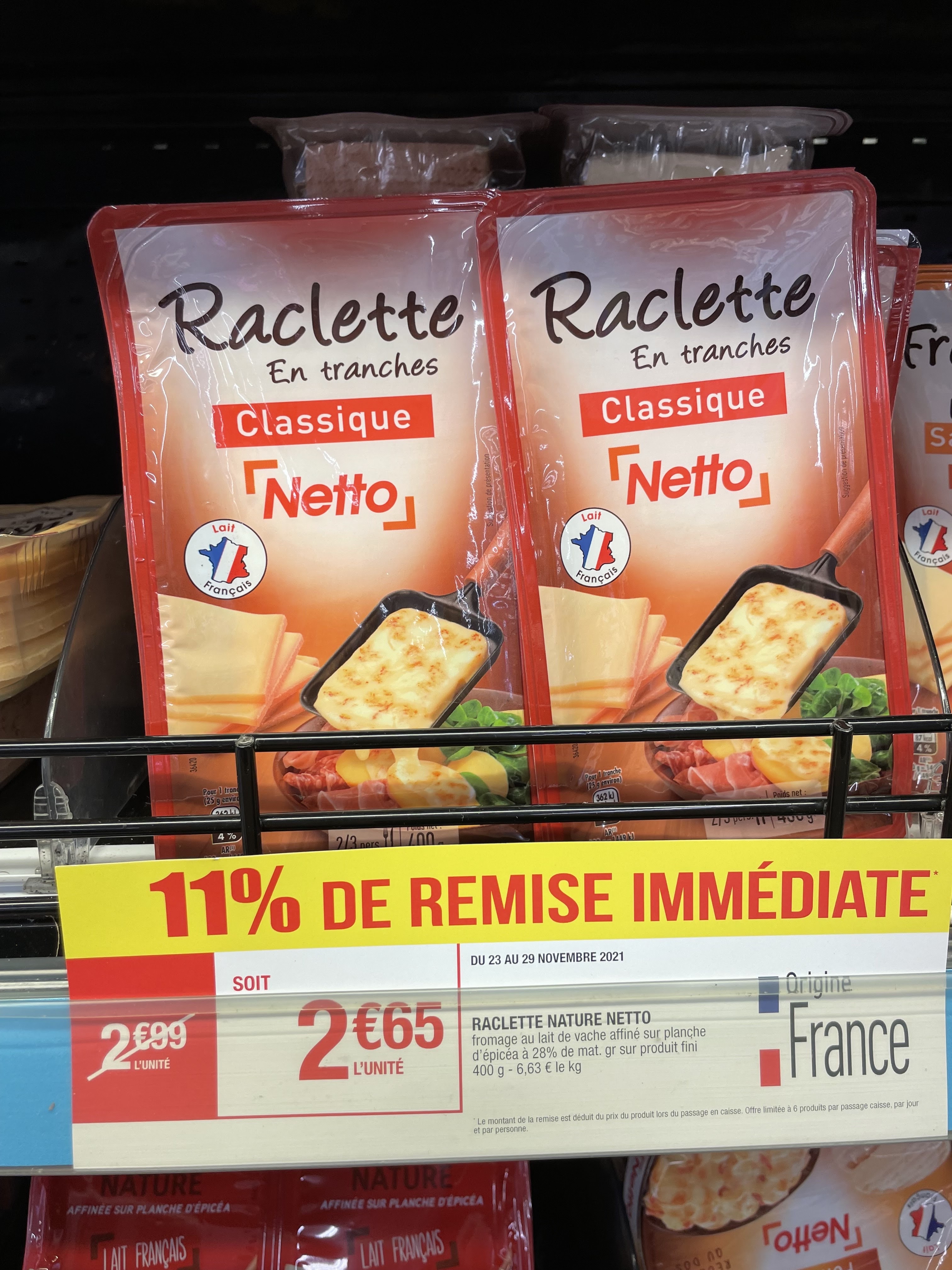 En promotion jusqu’au 28 novembre, le raclette nature netto a 2€65, la chiffonnade de bresaola montorsi a 3€27, la cervelas netto a 1€75, la chiffonnade de mortadelle italienne a 1€90, jambon cru 9 tranches a 4€50, le jambon pata negra labeyrie a 4€13, le fromage à tartiflette a 2€85, le grand lait candia -25% sur le 2ème produit soit 1€73 les 2 profitez en
