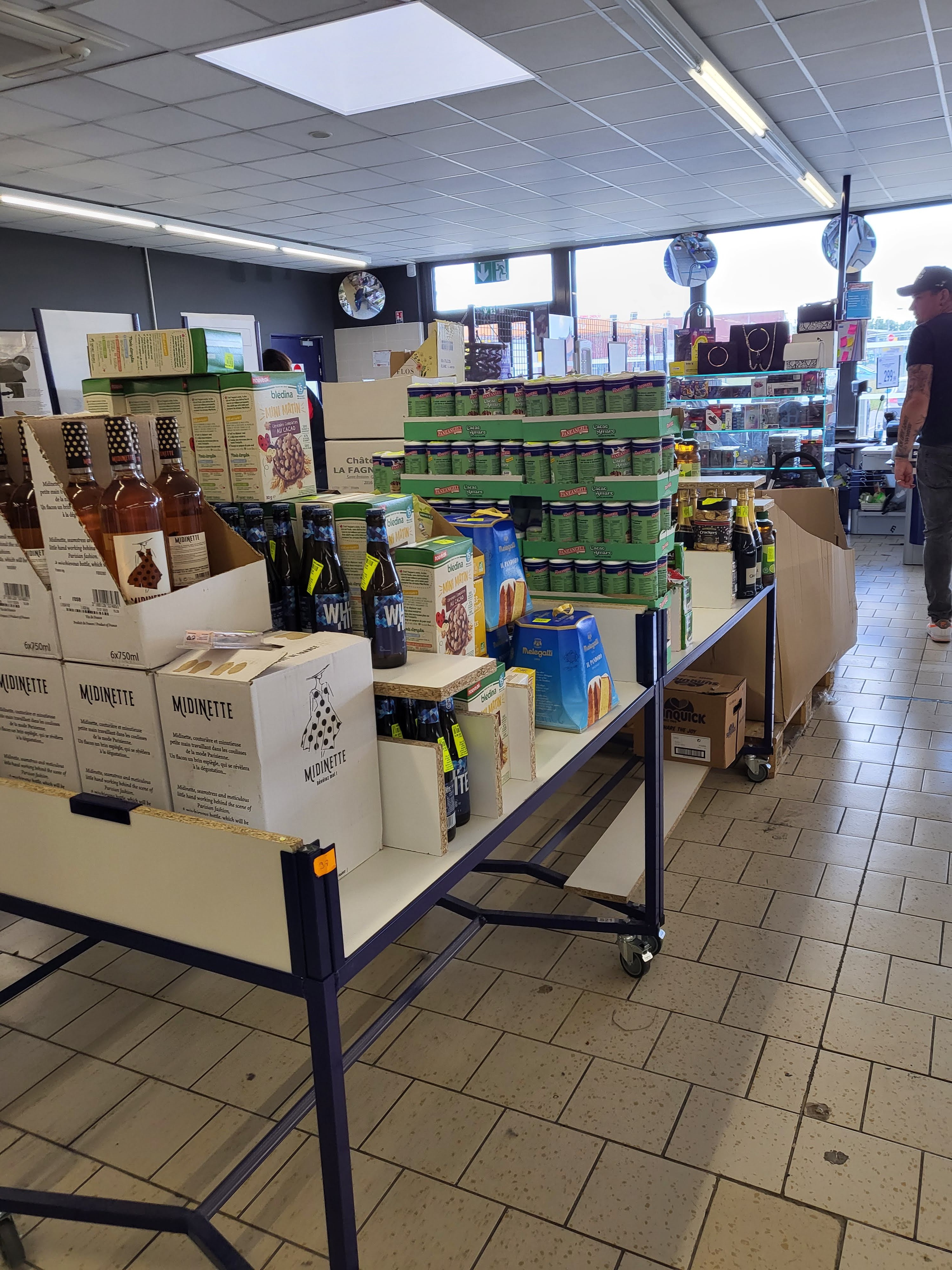 Le grand dommage, pas de caddies, vous vendez du vin, bières, difficile de prendre des cartons dans un panier