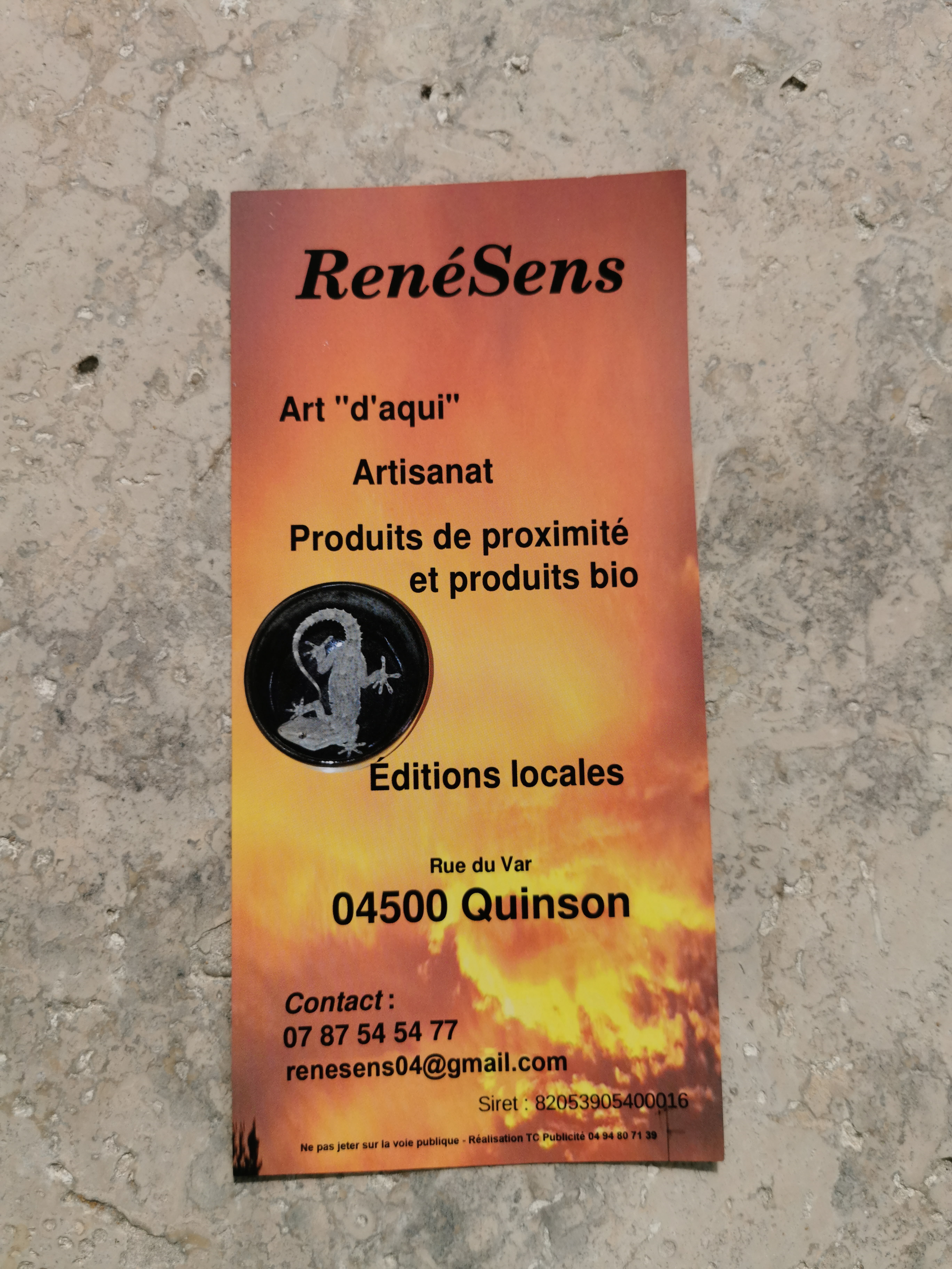 Voici toutes les informations sur le Magasin RenéSens - Artisanat et produits locaux qui ce trouve au 7122 Rue du Var, 04500 Quinson (04). Sur cette fiche vous trouverez les photos, l'adresse, les horaires d'ouverture, le numero de téléphone et les avis clients.Vous pouvez églement rédiger un avis si vous le souhaitez en bas de page.