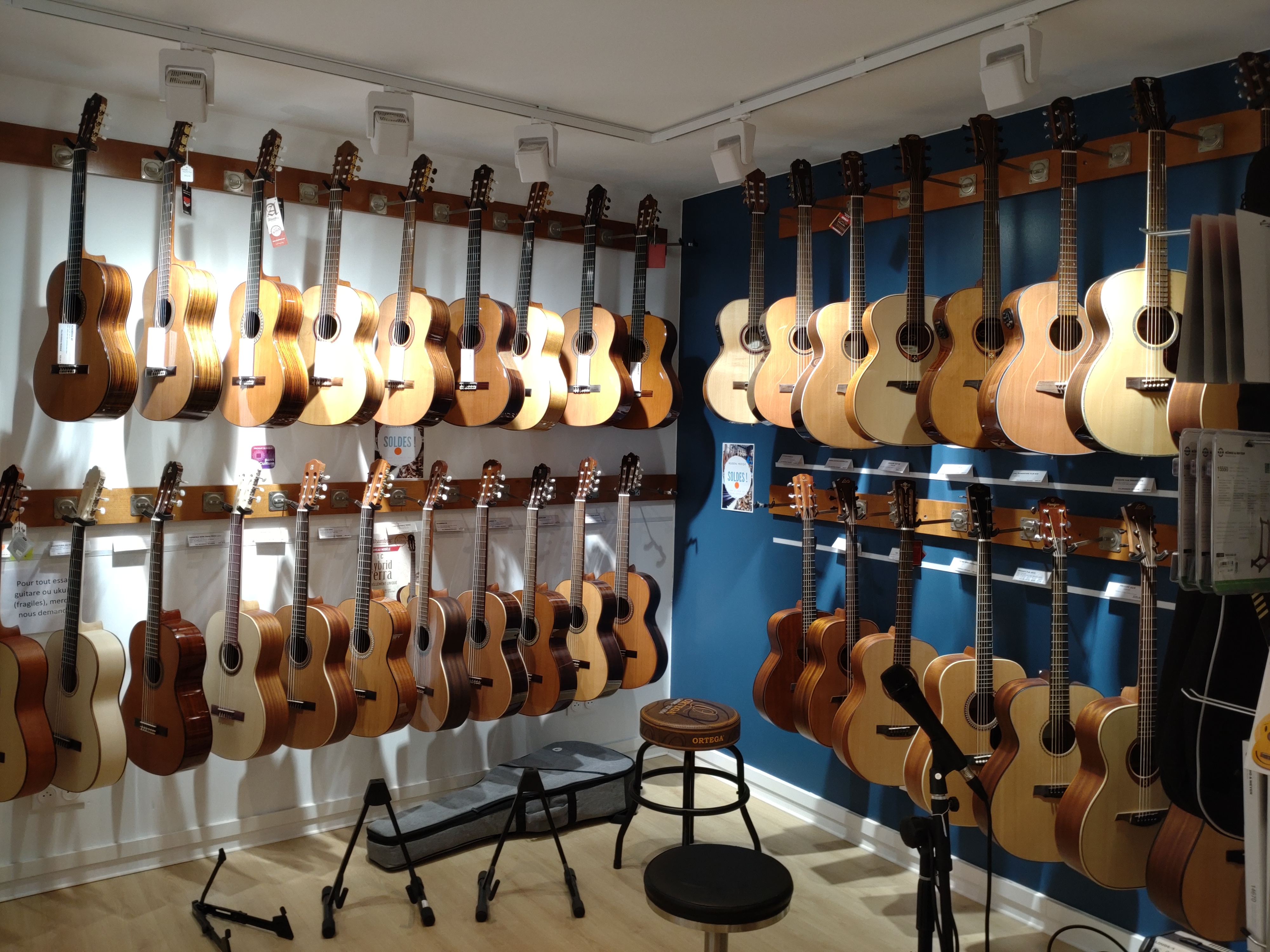 Ils proposent une bonne sélection de guitares classiques et acoustiques, ainsi que divers accessoires tels que des cordes et des médiators. Le personnel est gentil et assure également le service après-vente.